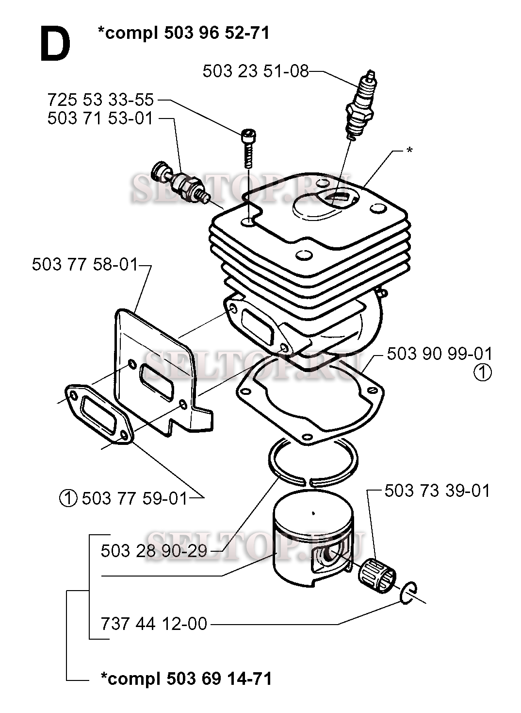 Поршень, цилиндр для бензопилы Husqvarna 362 XP (с 1998-08), взрыв-схема: