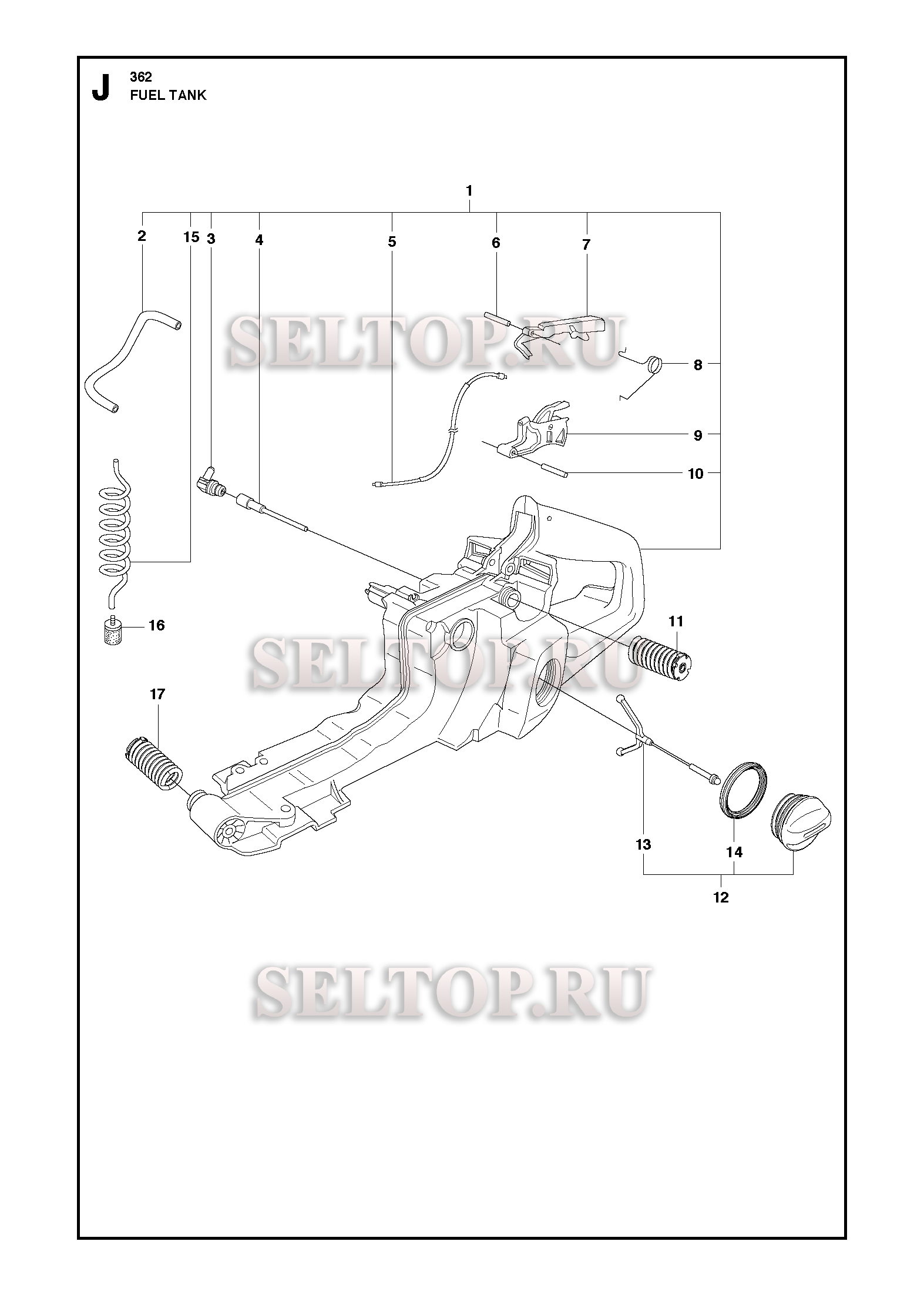 Топливный бак для бензопилы Husqvarna 362 (с 2013-12), взрыв-схема:
