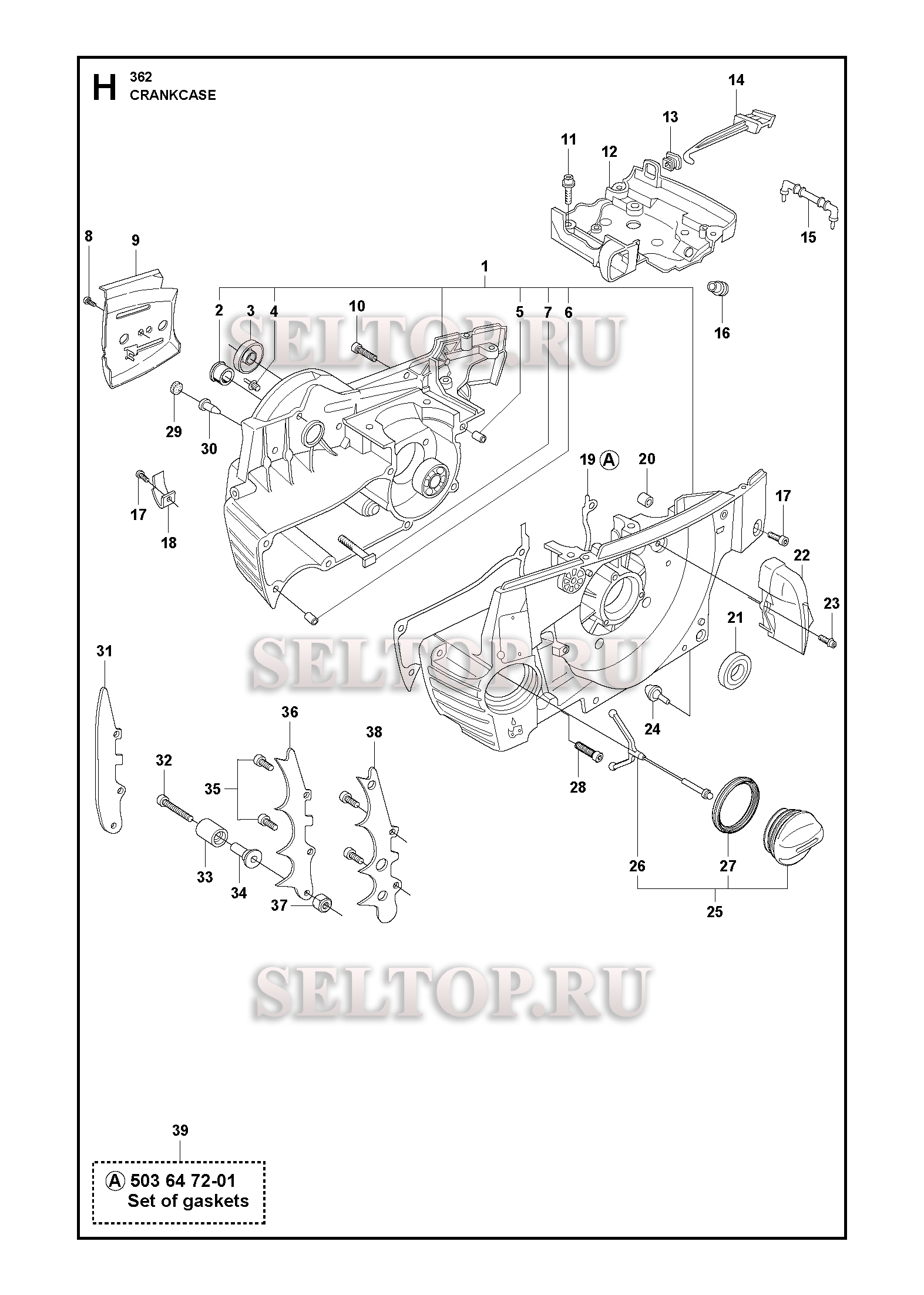 Картер для бензопилы Husqvarna 362 (с 2017-10), взрыв-схема: