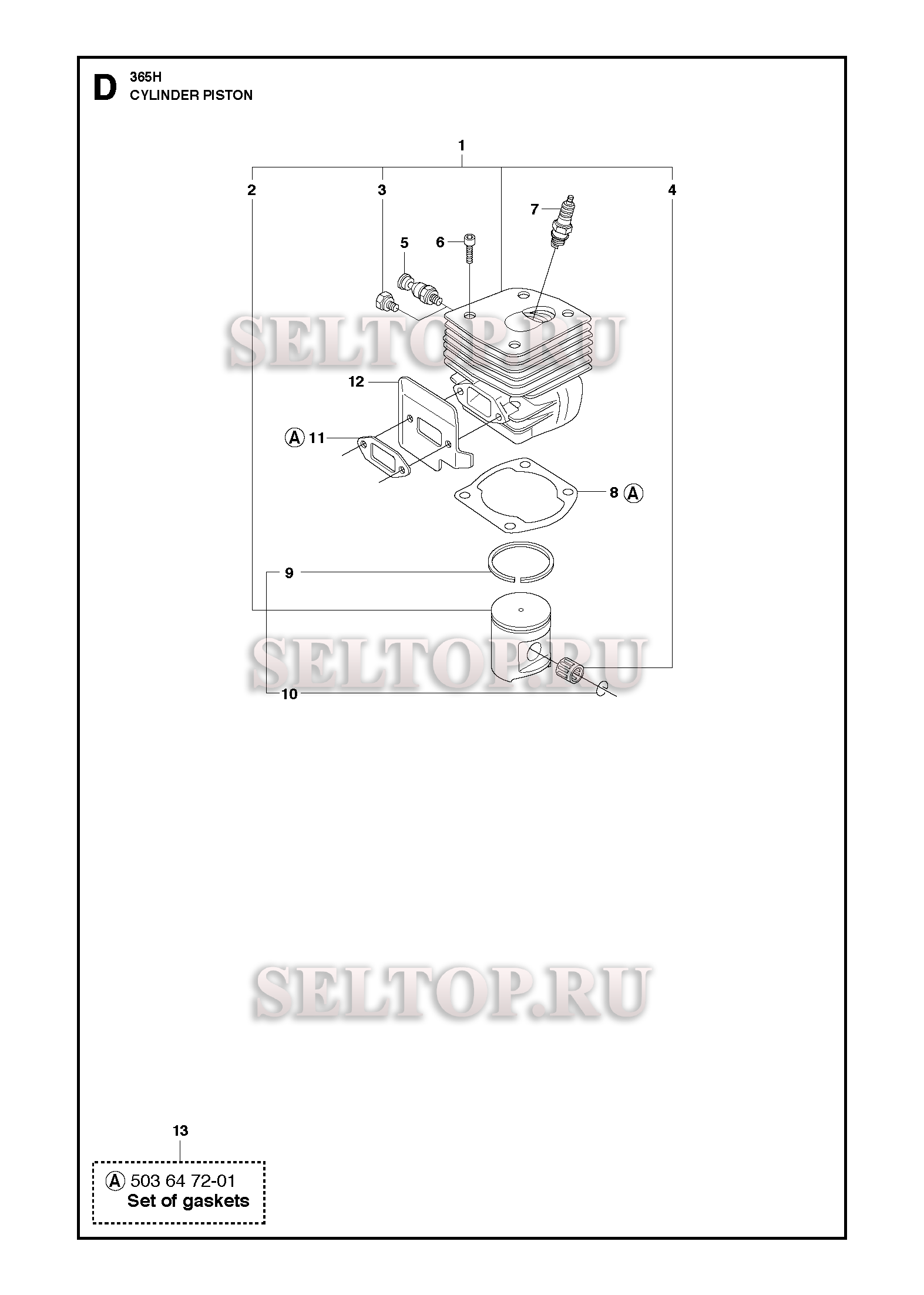 Поршень, цилиндр для бензопилы Husqvarna 365 H (с 2017-10), взрыв-схема:
