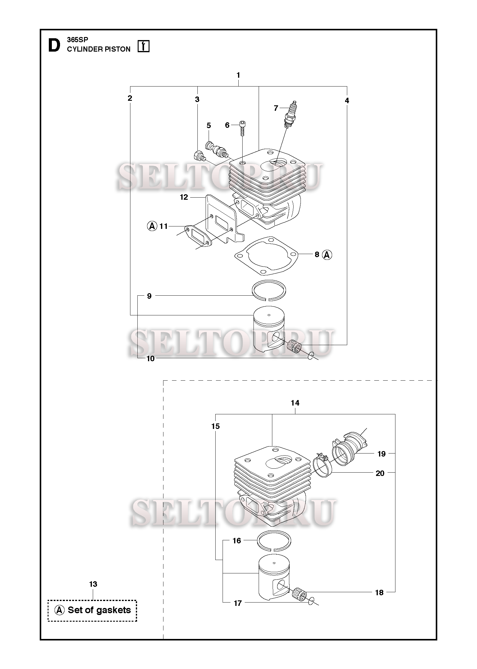 Поршень, цилиндр для бензопилы Husqvarna 365 SP (с 2013-12), взрыв-схема:
