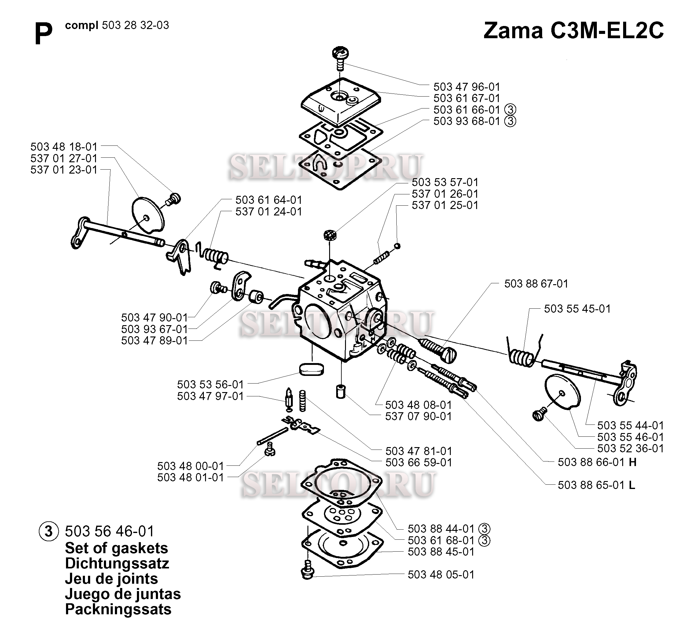 Запчасти карбюратора для бензопилы Husqvarna 365 SPECIAL (с 2003-11), взрыв-схема: