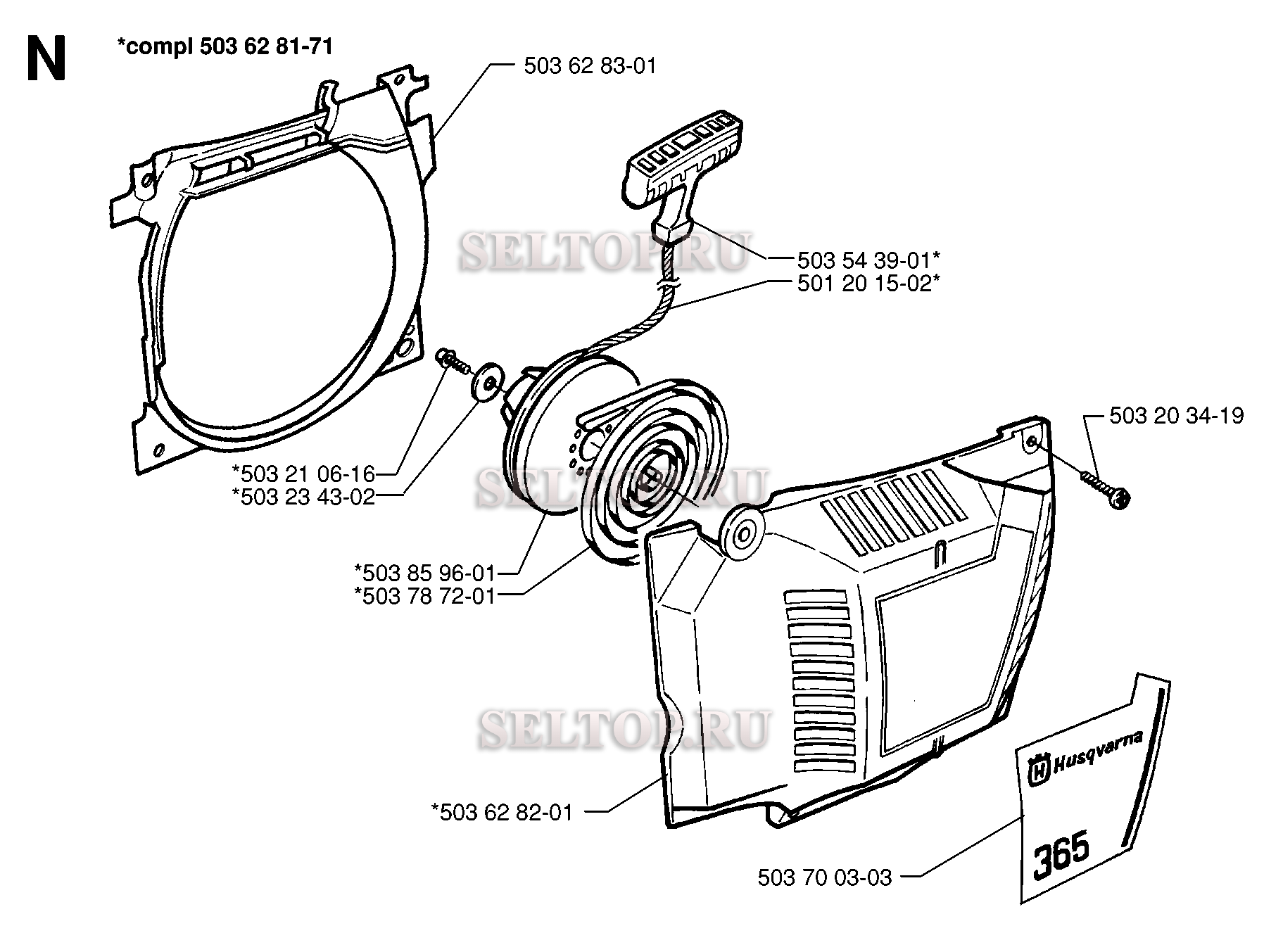 Стартер для бензопилы Husqvarna 365 (с 1997-12), взрыв-схема: