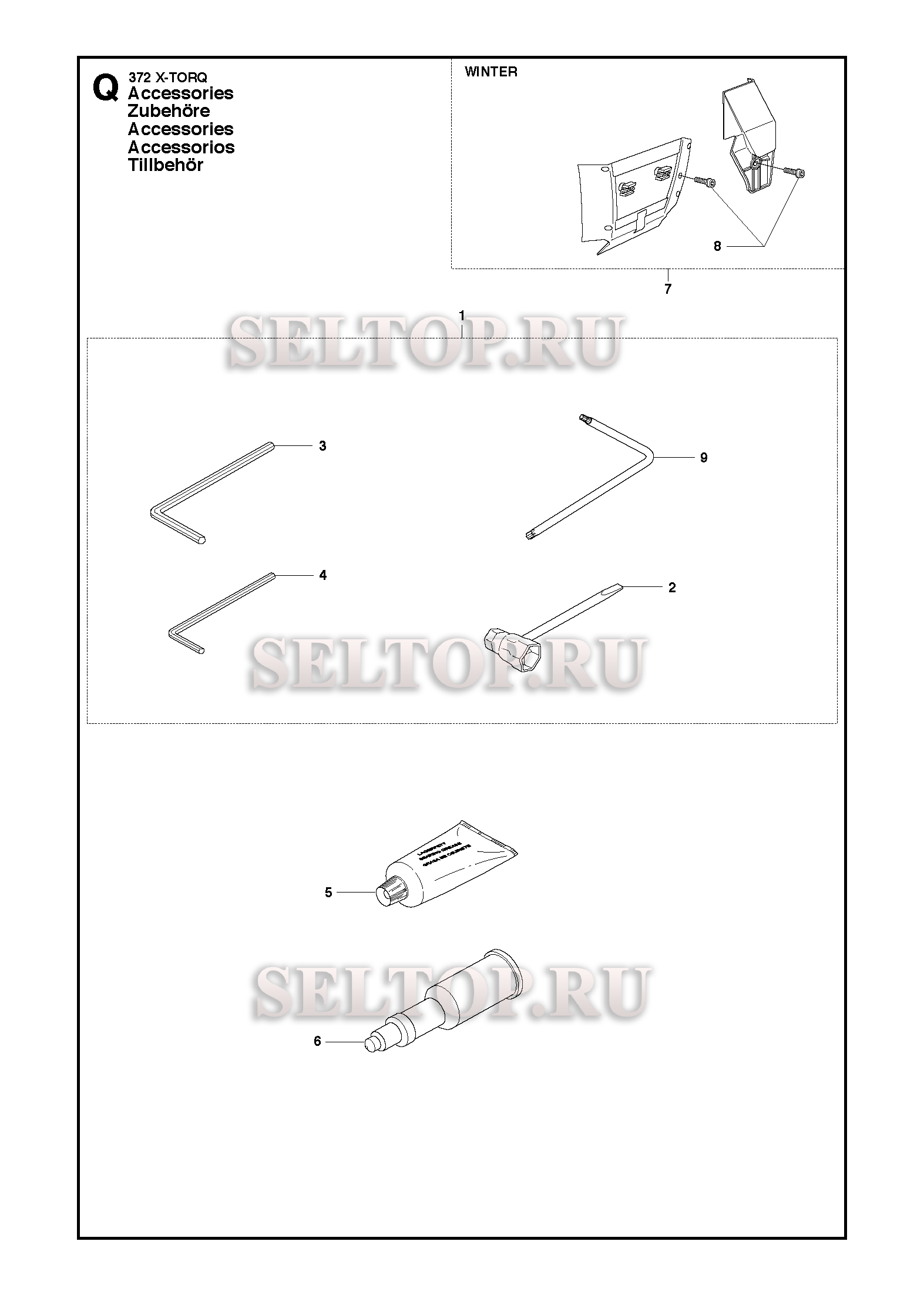 Аксессуары для бензопилы Husqvarna 372 XP X-TORQ (с 2016-10), взрыв-схема: