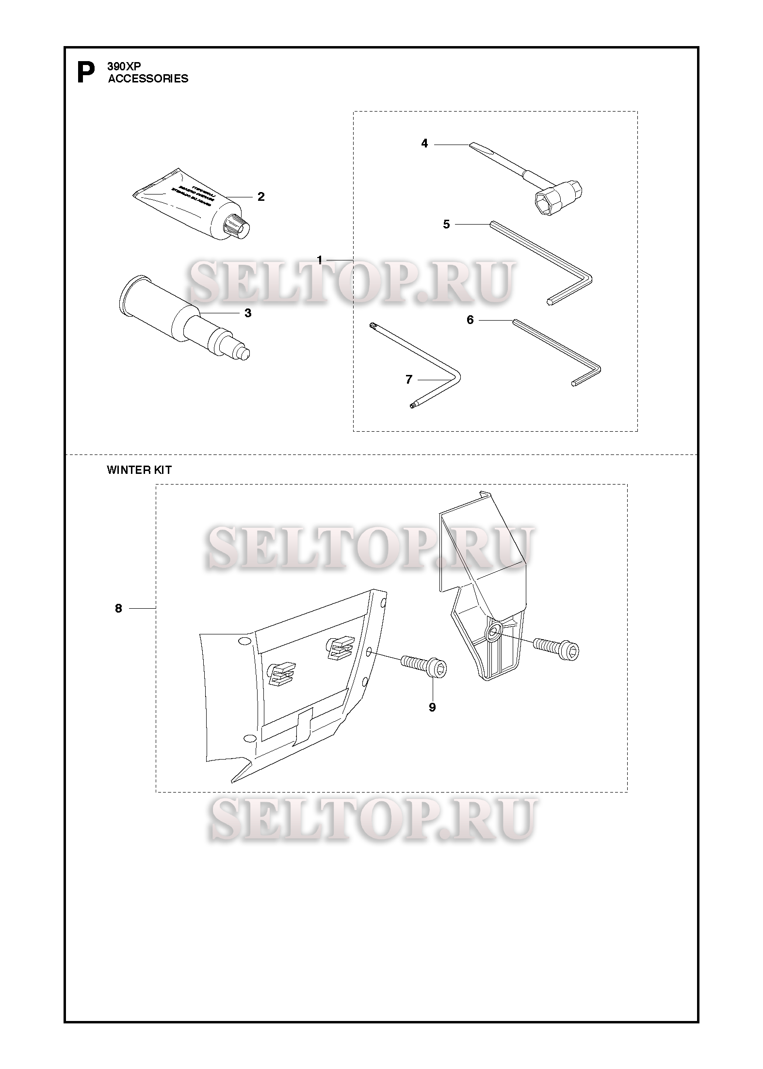 Аксессуары для бензопилы Husqvarna 390 XP (с 2018-06), взрыв-схема: