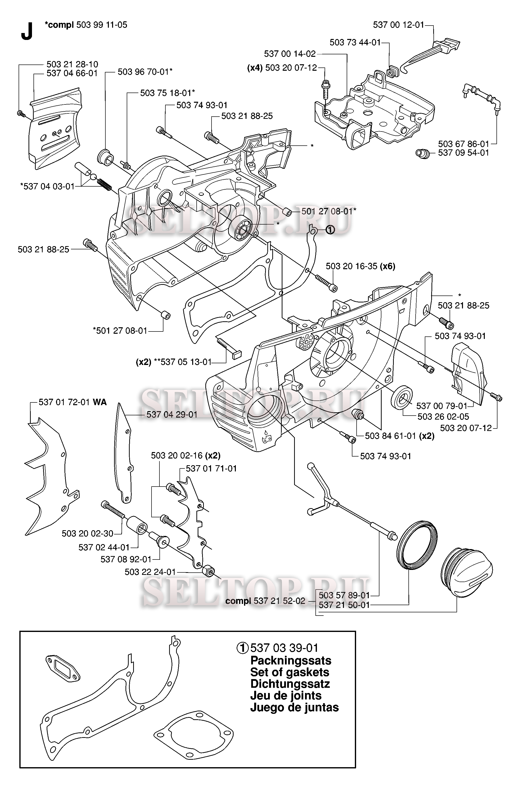 Картер для бензопилы Husqvarna 390 (с 2006-10), взрыв-схема: