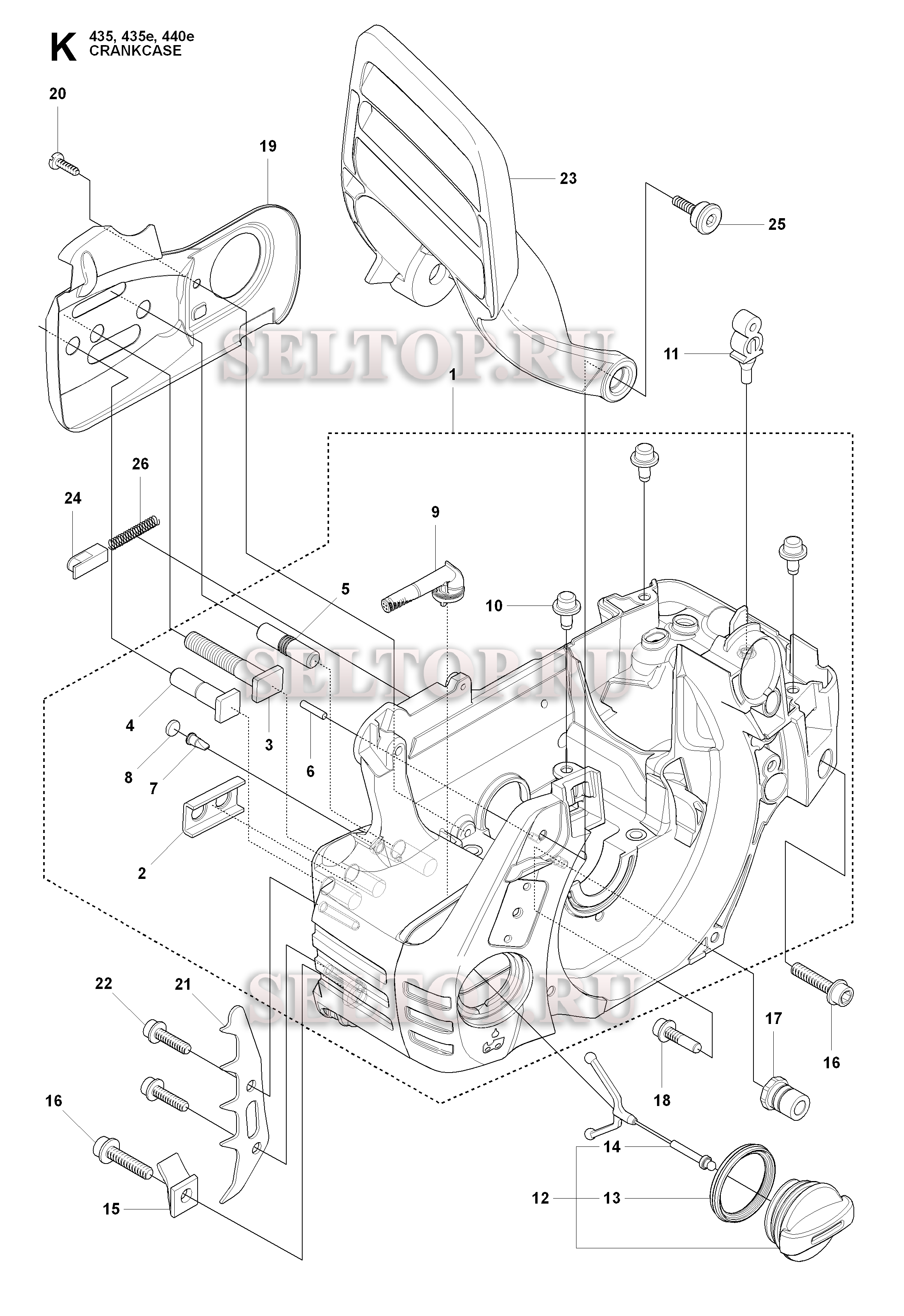 Картер для бензопилы Husqvarna 435 (с 2009-02), взрыв-схема: