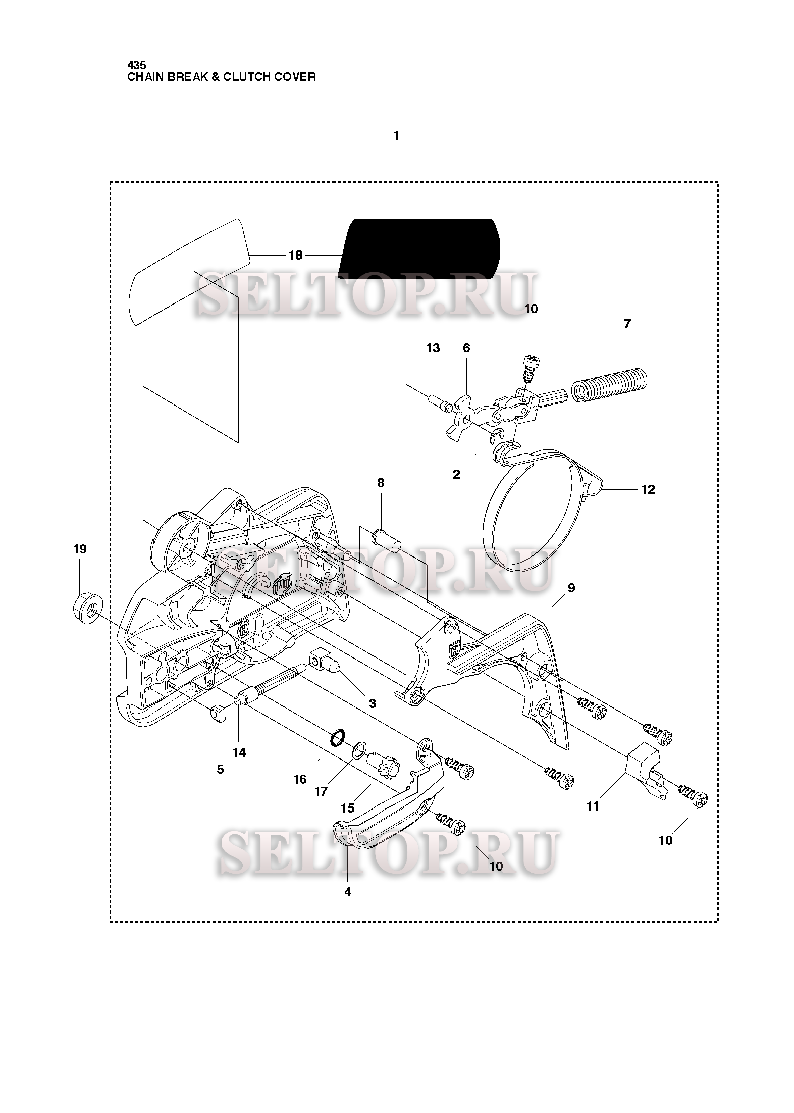 Тормоз цепи, крышка сцепления для бензопилы Husqvarna 435 (с 2010-06), взрыв-схема: