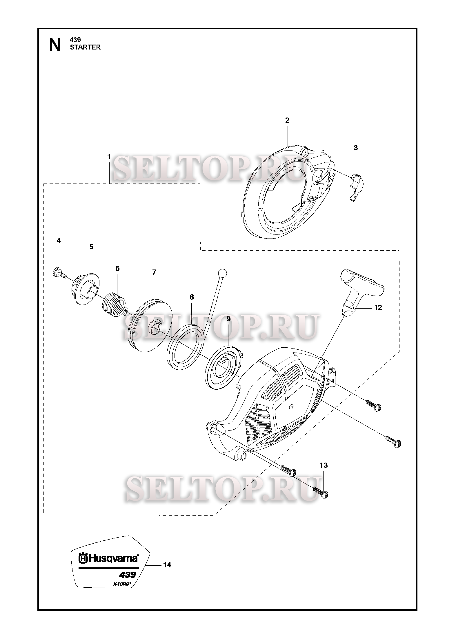 Стартер для бензопилы Husqvarna 439 (с 2017-12), взрыв-схема: