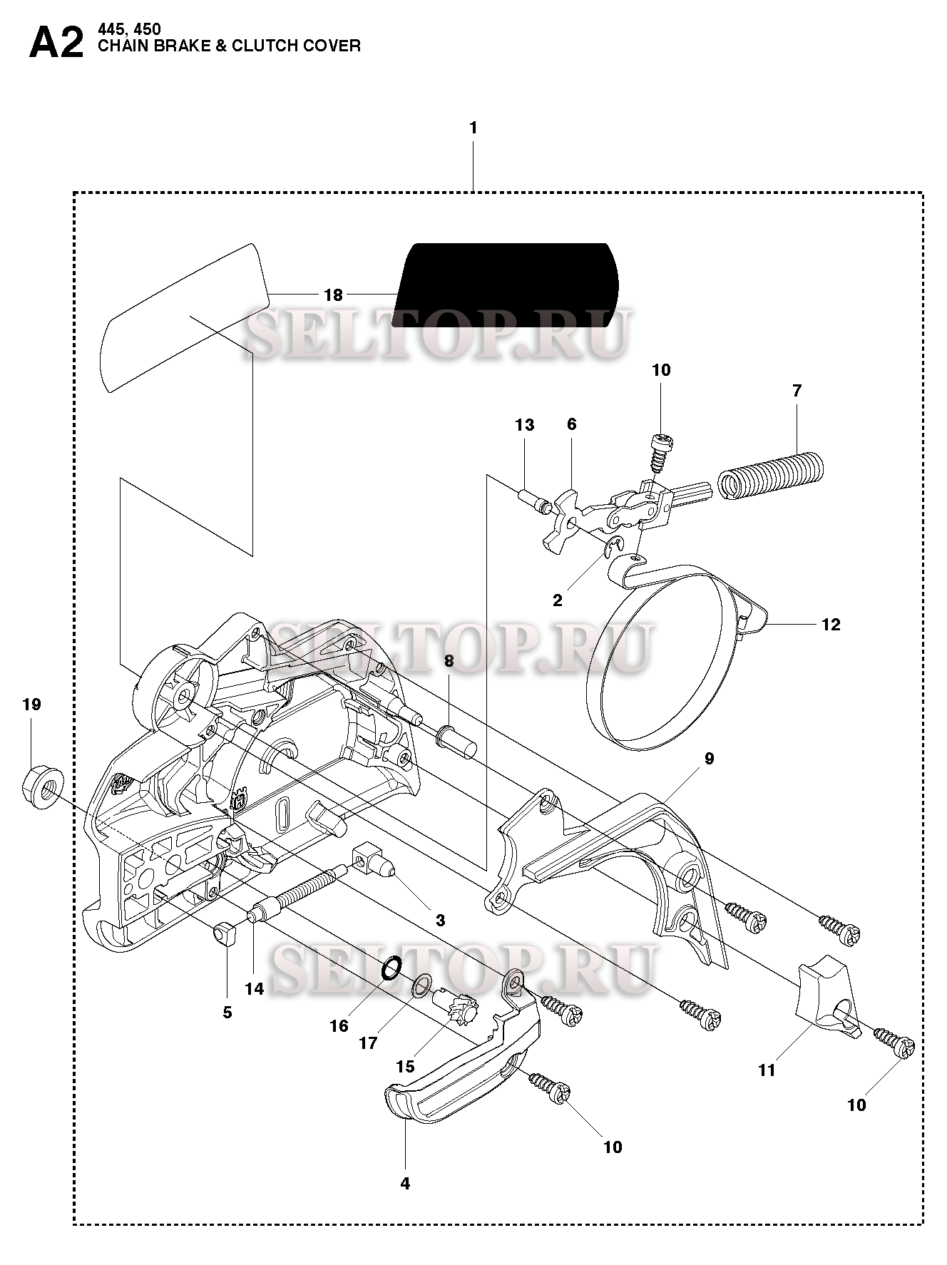 Тормоз цепи, крышка сцепления для бензопилы Husqvarna 445 E (с 2010-09), взрыв-схема: