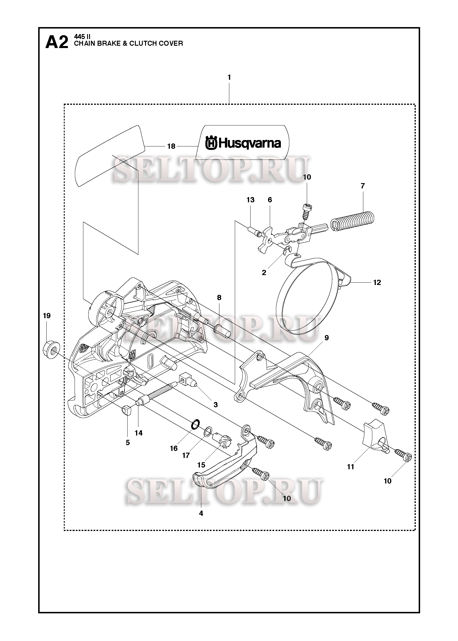 Тормоз цепи, крышка сцепления для бензопилы Husqvarna 445 II, взрыв-схема:
