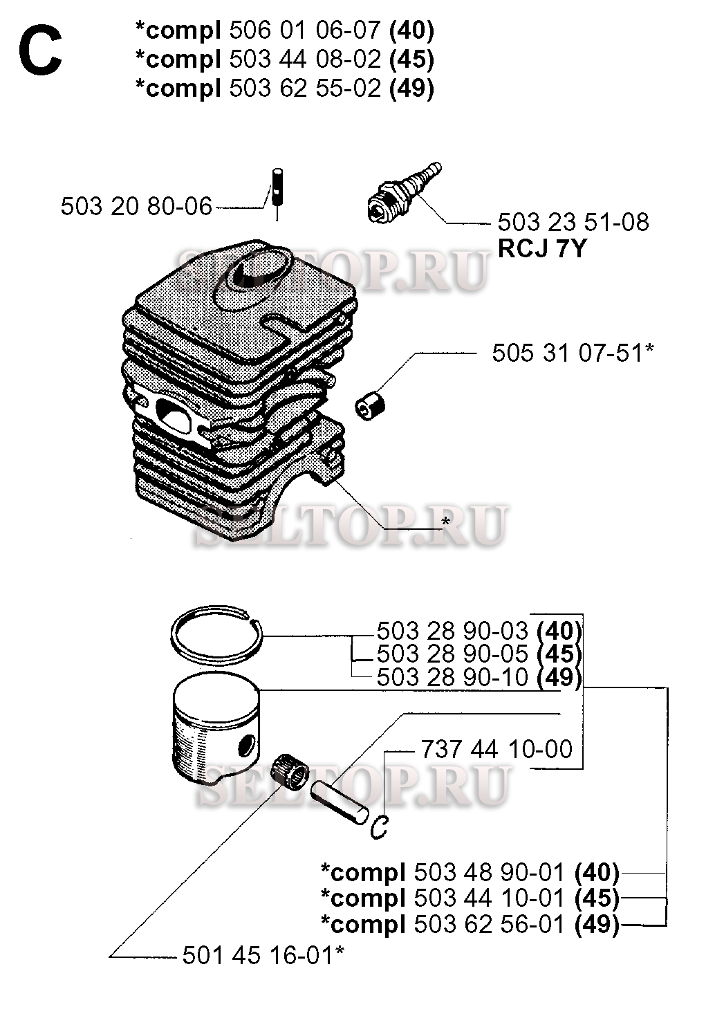 Поршень, цилиндр для бензопилы Husqvarna 45 EPA (с 2001-09), взрыв-схема: