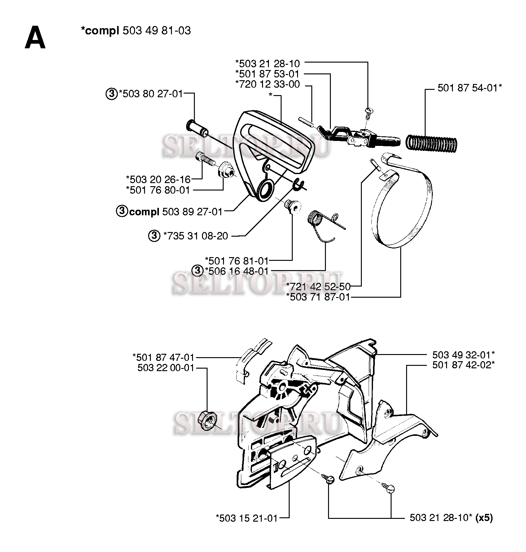 Тормоз цепи, крышка сцепления для бензопилы Husqvarna 51 EPA (с 2000-05), взрыв-схема: