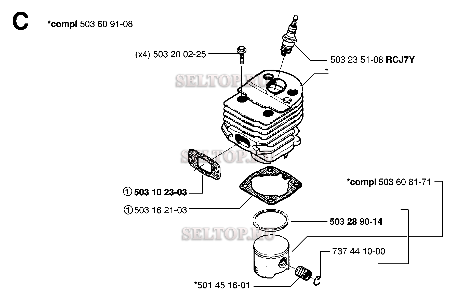 Поршень, цилиндр для бензопилы Husqvarna 55 RANCHER EPA (с 1998-08), взрыв-схема: