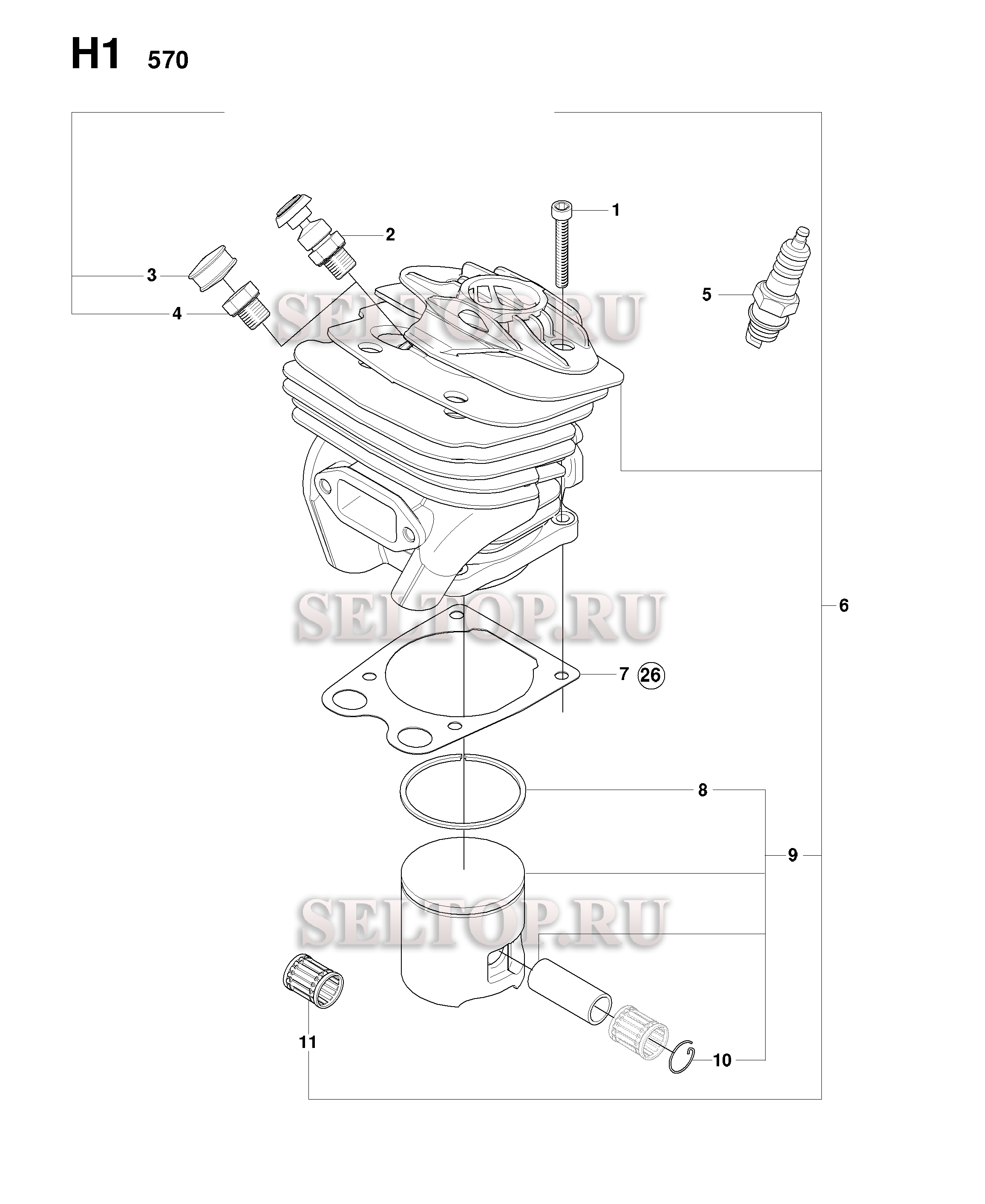 Поршень, цилиндр для бензопилы Husqvarna 570, 570 EPA (с 2008-08), взрыв-схема: