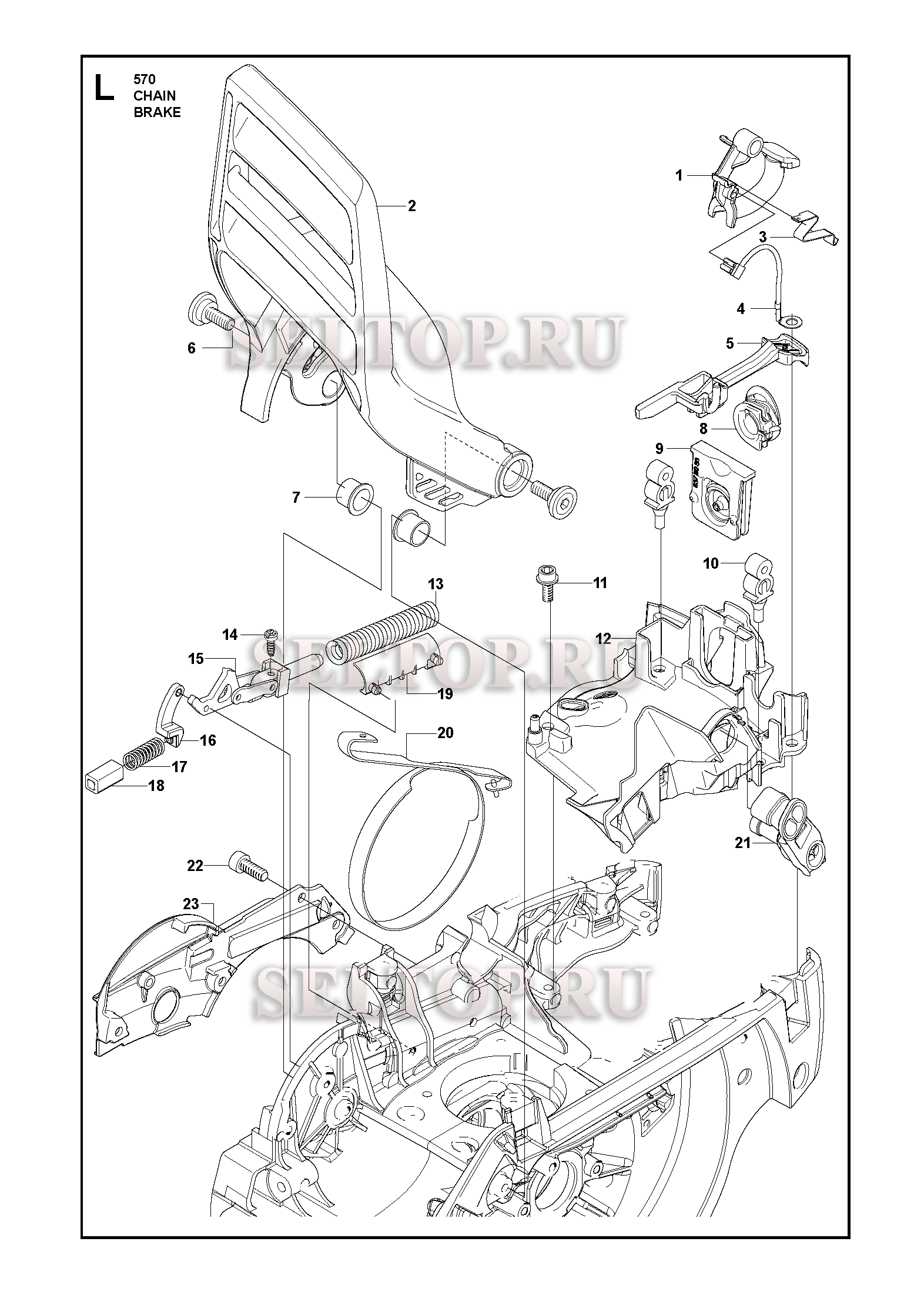 Тормоз цепи для бензопилы Husqvarna 570 (с 2009-08), взрыв-схема: