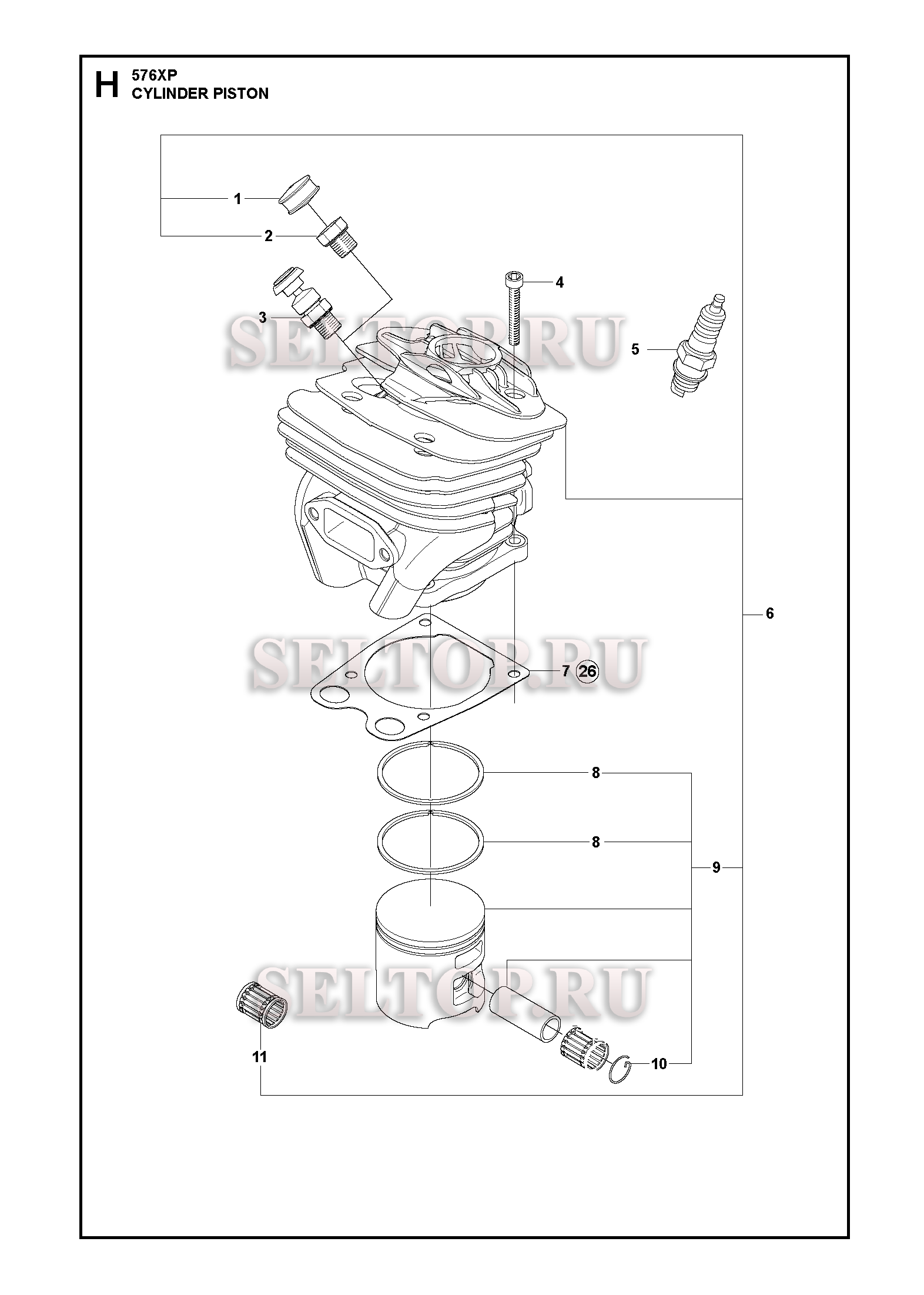 Поршень, цилиндр для бензопилы Husqvarna 576 XP, 576 XP EPA (с 2010-01), взрыв-схема: