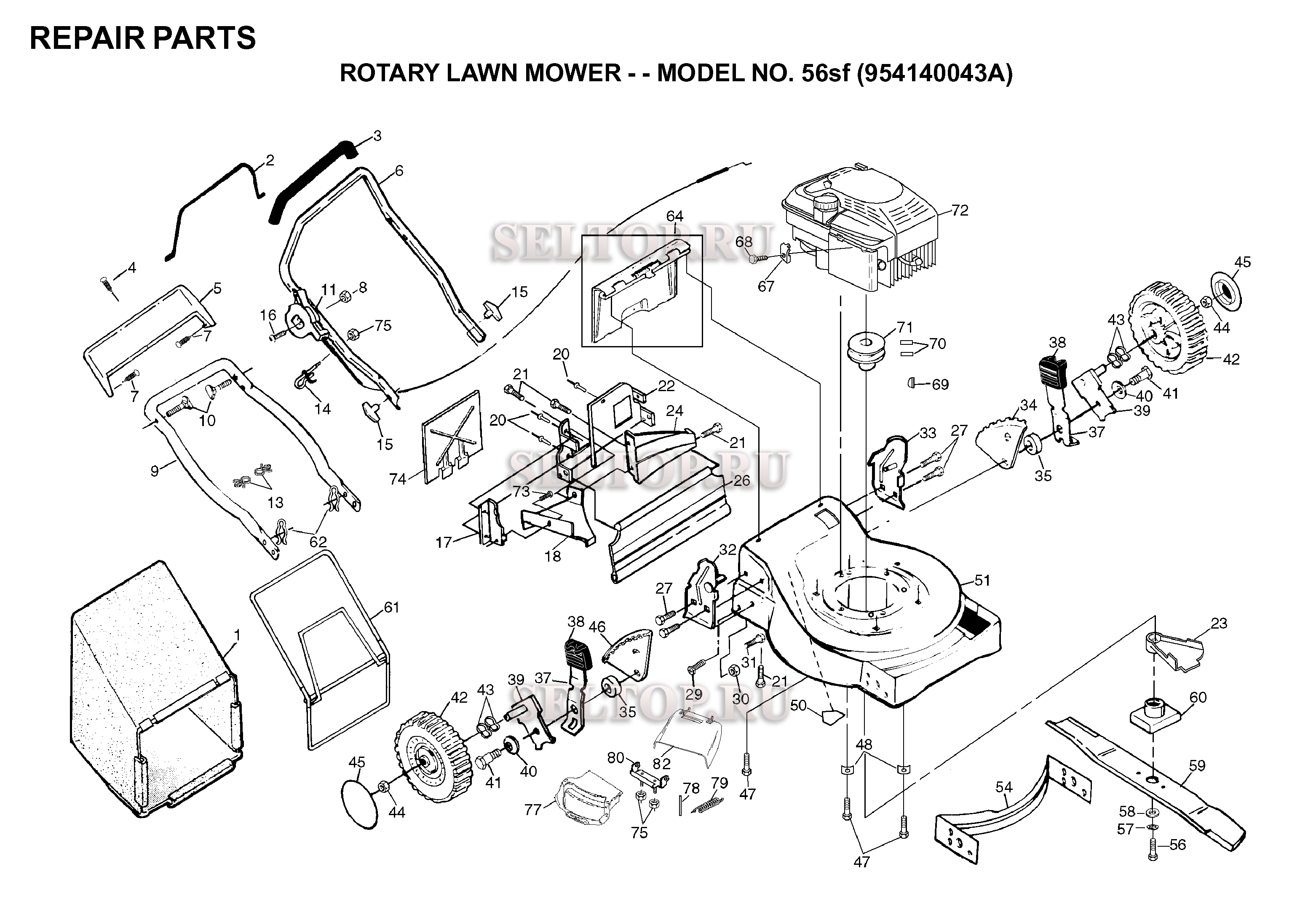 Общая деталировка для газонокосилки Husqvarna 56 SF артикул модели 954140043A (с 1998-02)