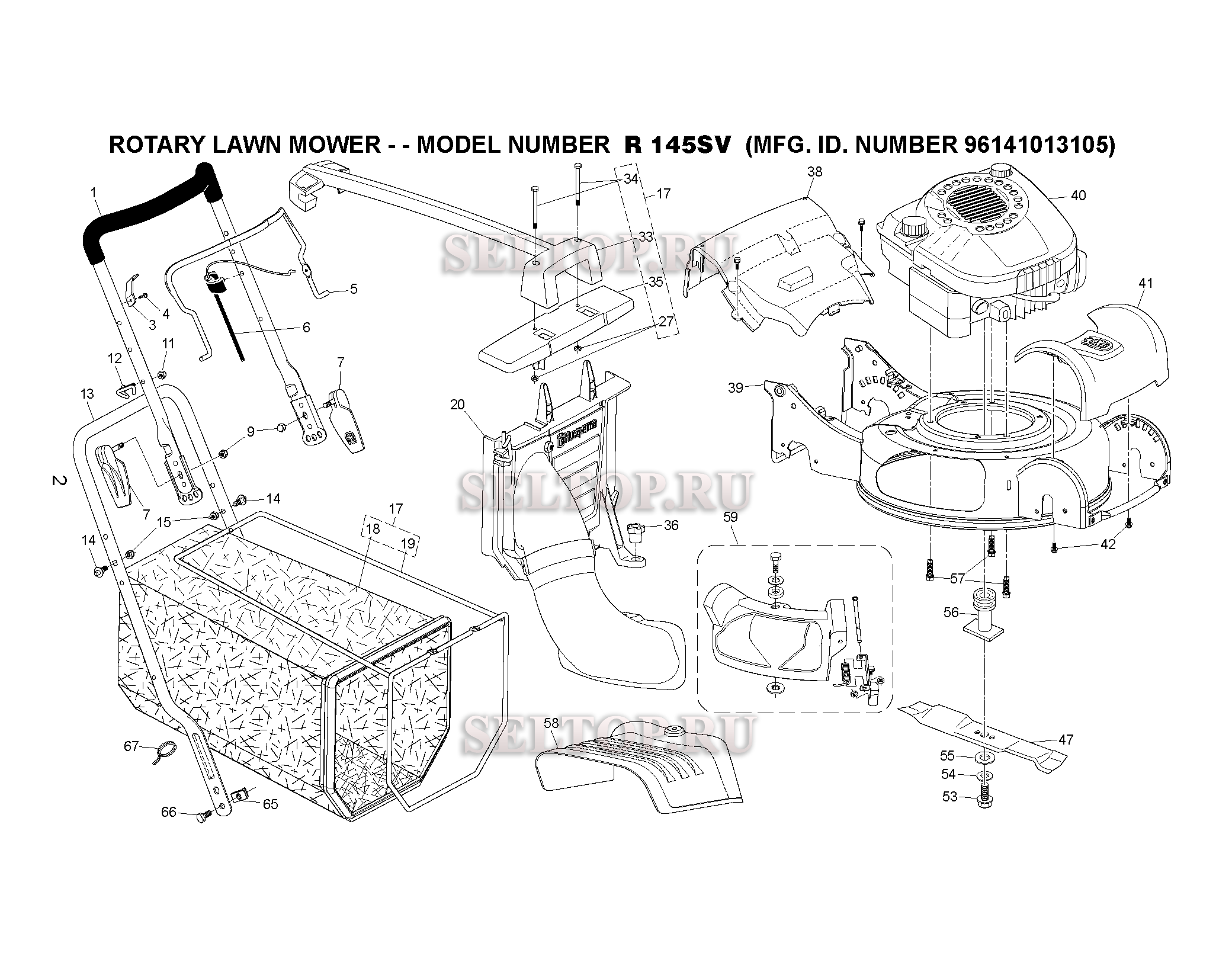 Ручки, двигатель для газонокосилки Husqvarna R 145 SV артикул модели 96141013105 (с 2010-01)