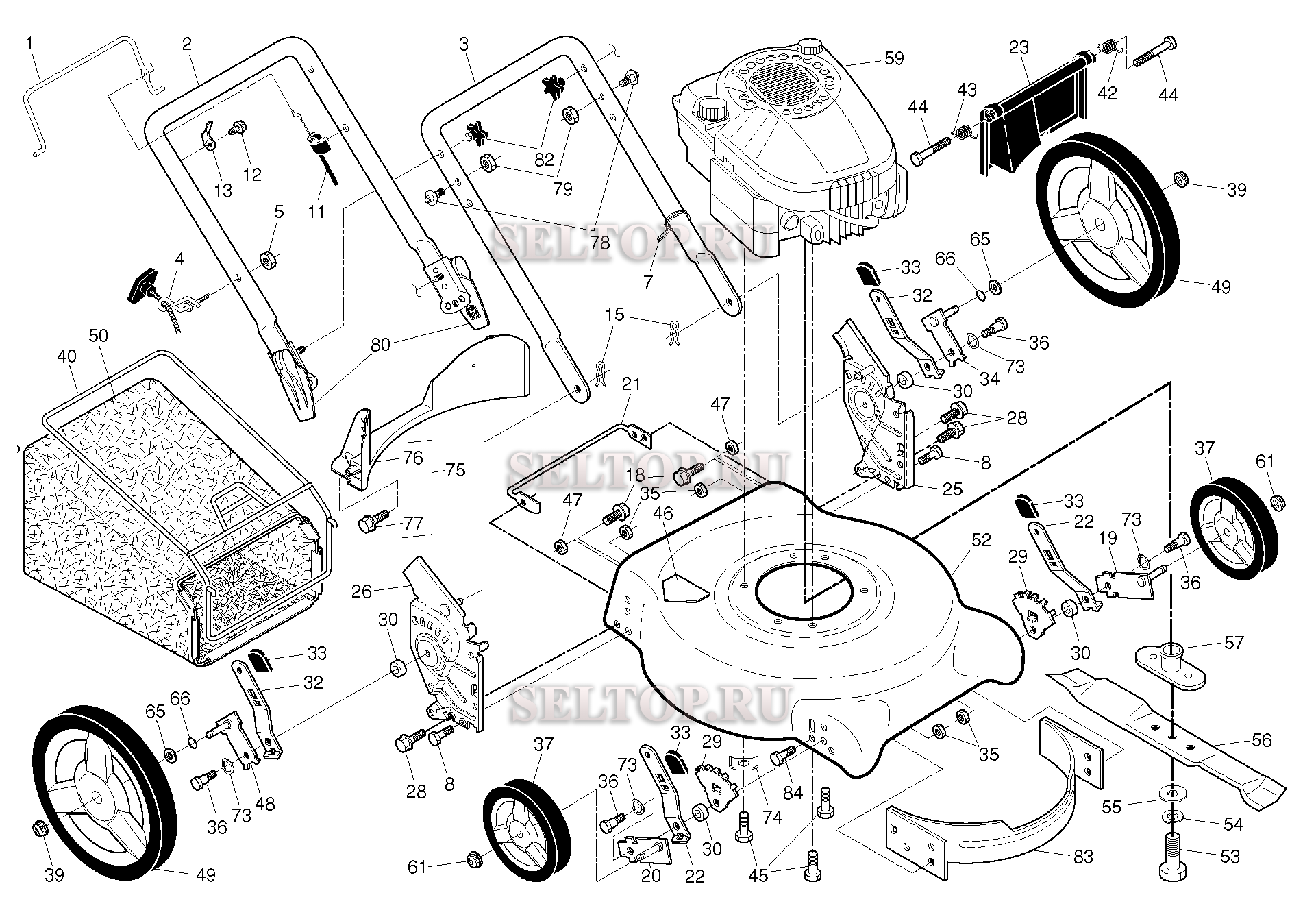 Рама и двигатель для газонокосилки Husqvarna R 53 артикул модели 96131002313 (с 2012-11), взрыв-схема: