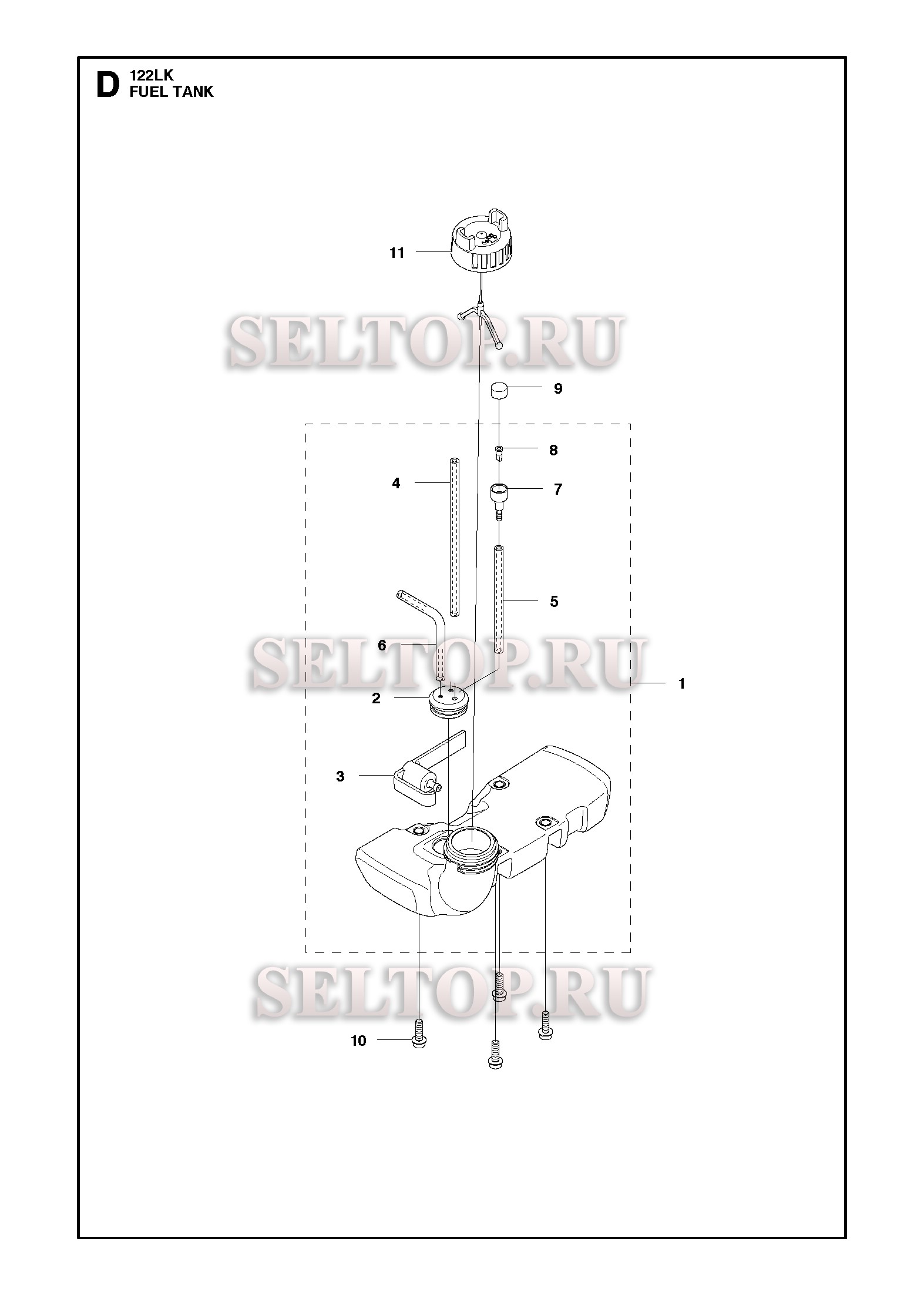 Топливный бак для триммера Husqvarna 122 LK (артикул модели 967252801), взрыв-схема: