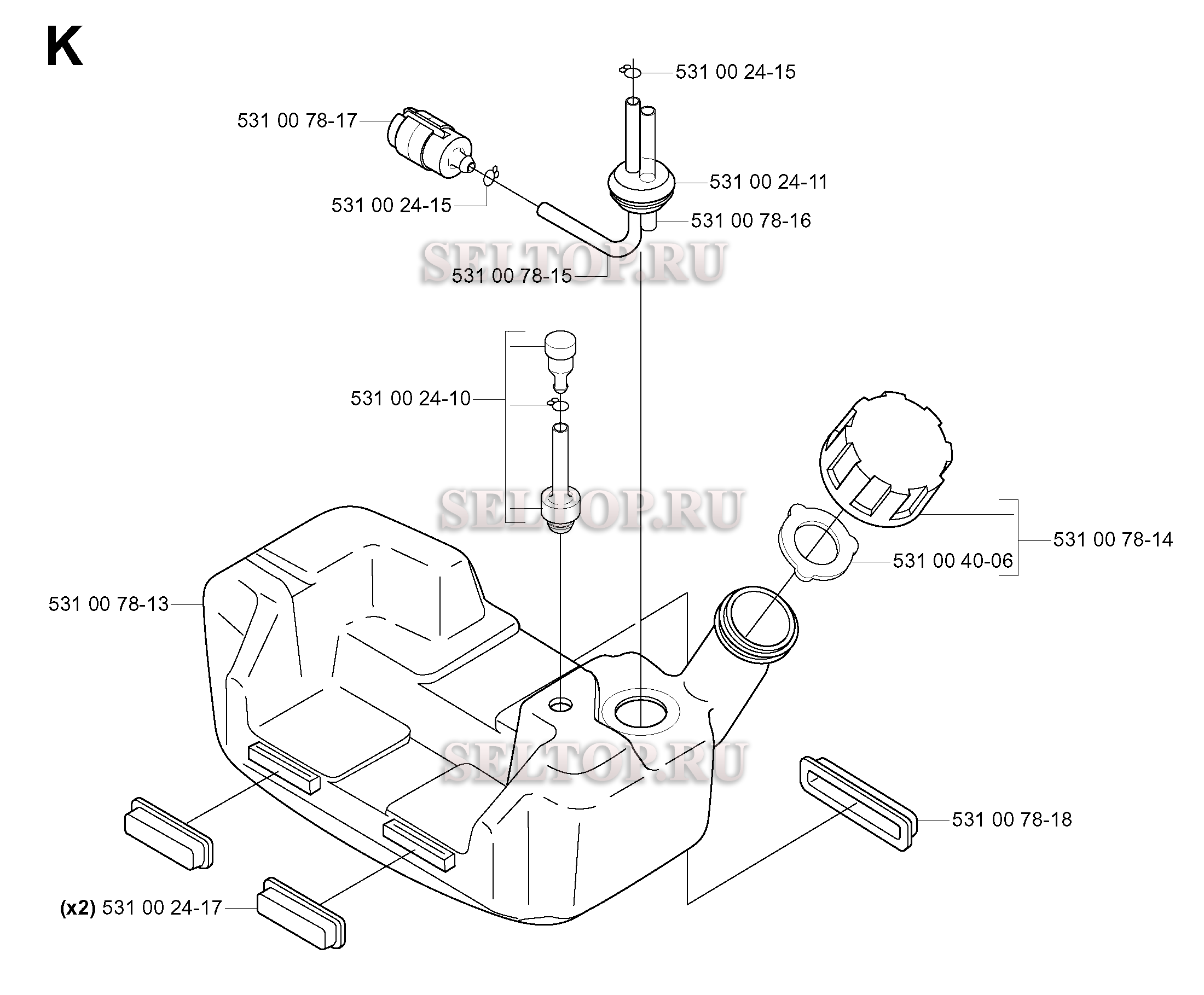 Топливный бак для триммера Husqvarna 143 R (c 2005-10), взрыв-схема: