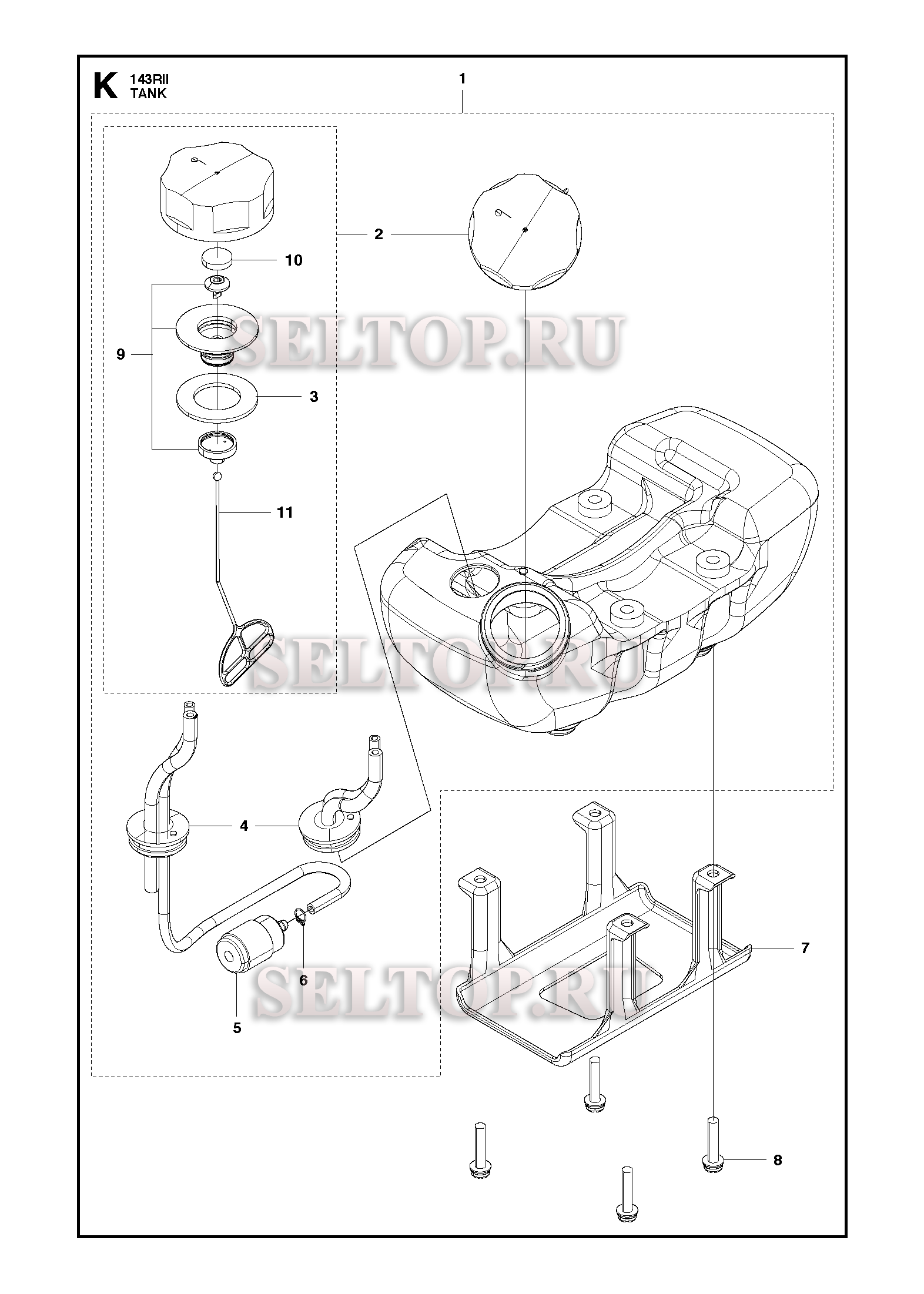 Топливный бак для триммера Husqvarna 143 RII (c 2008-06), взрыв-схема: