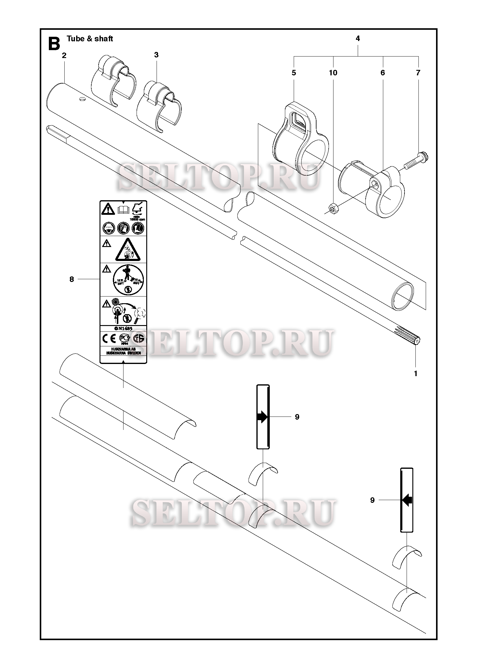 Трубка вала, ведущий вал для триммера Husqvarna 143 RII (c 2008-06), взрыв-схема: