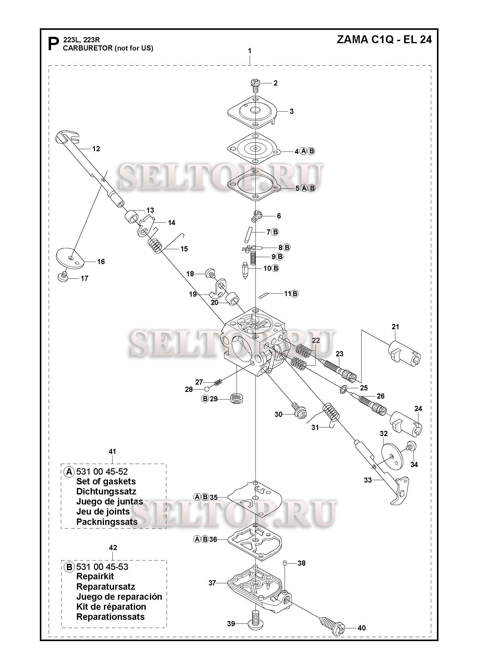 Карбюратор (не для США) для триммера Husqvarna 223 L (c 2006-01), взрыв-схема: