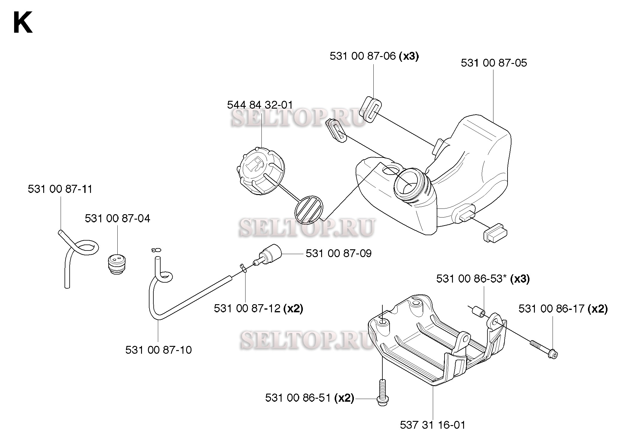 Топливный бак для триммера Husqvarna 224 L, взрыв-схема: