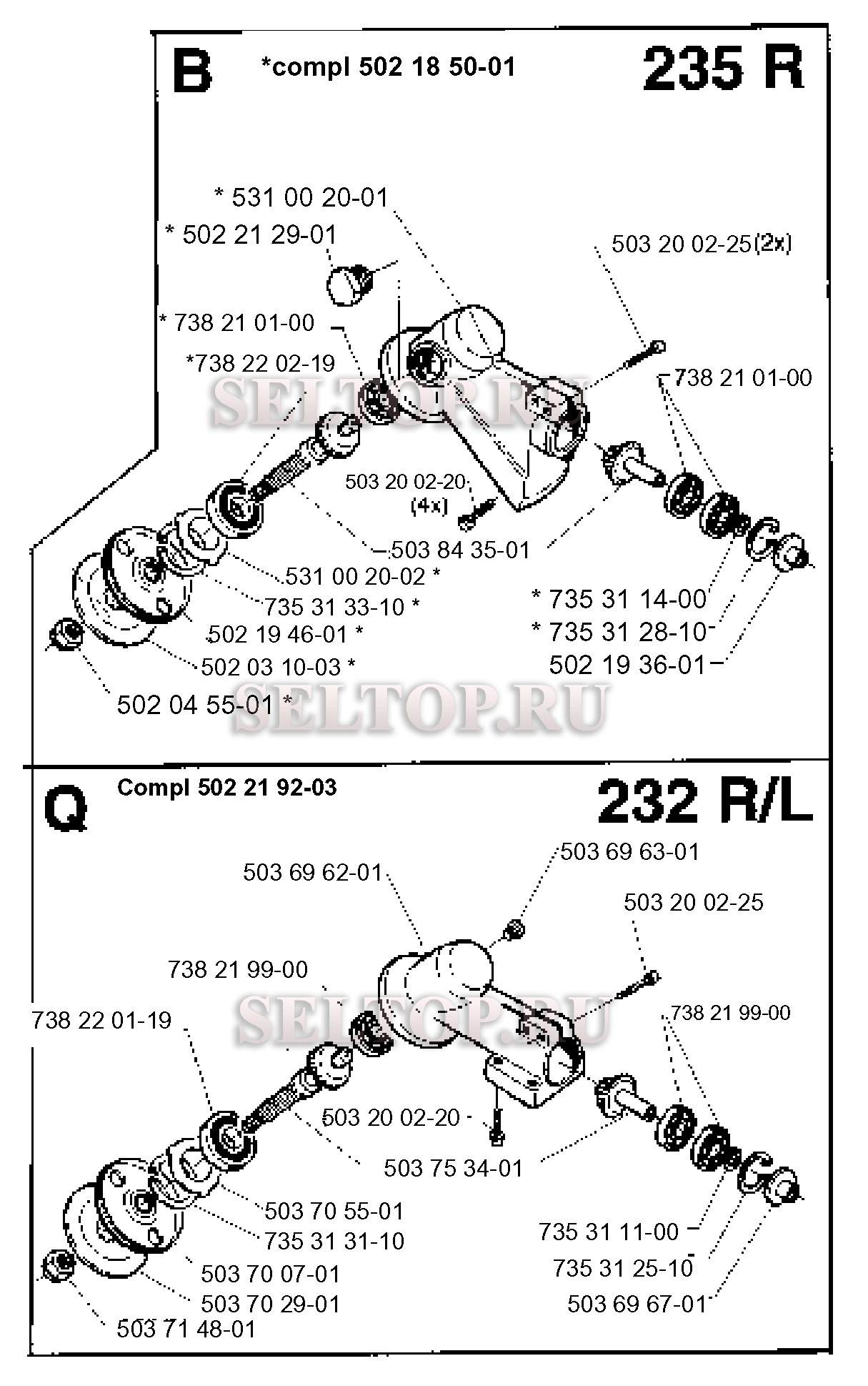 Редуктор для триммера Husqvarna 232 L (с 1995-11), взрыв-схема: