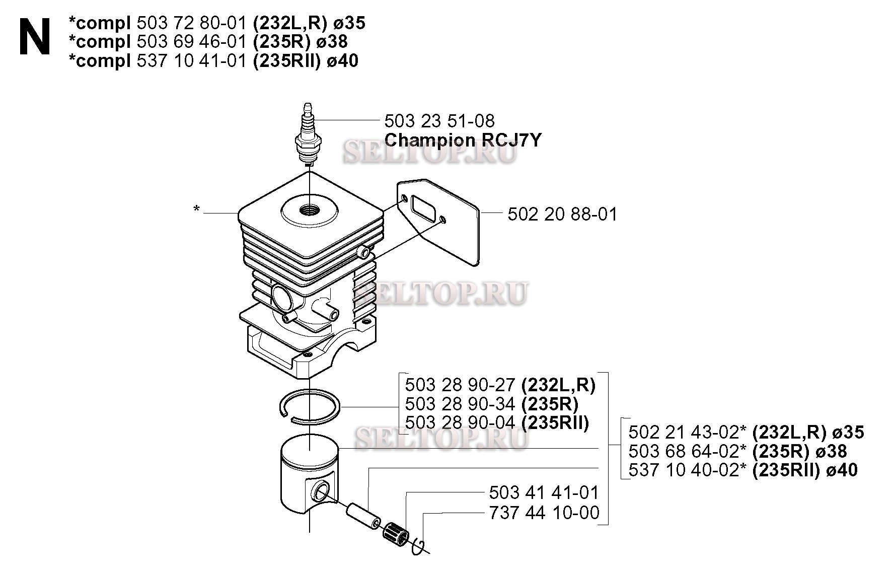 Поршень, цилиндр для триммера Husqvarna 232 L (с 2006-01), взрыв-схема: