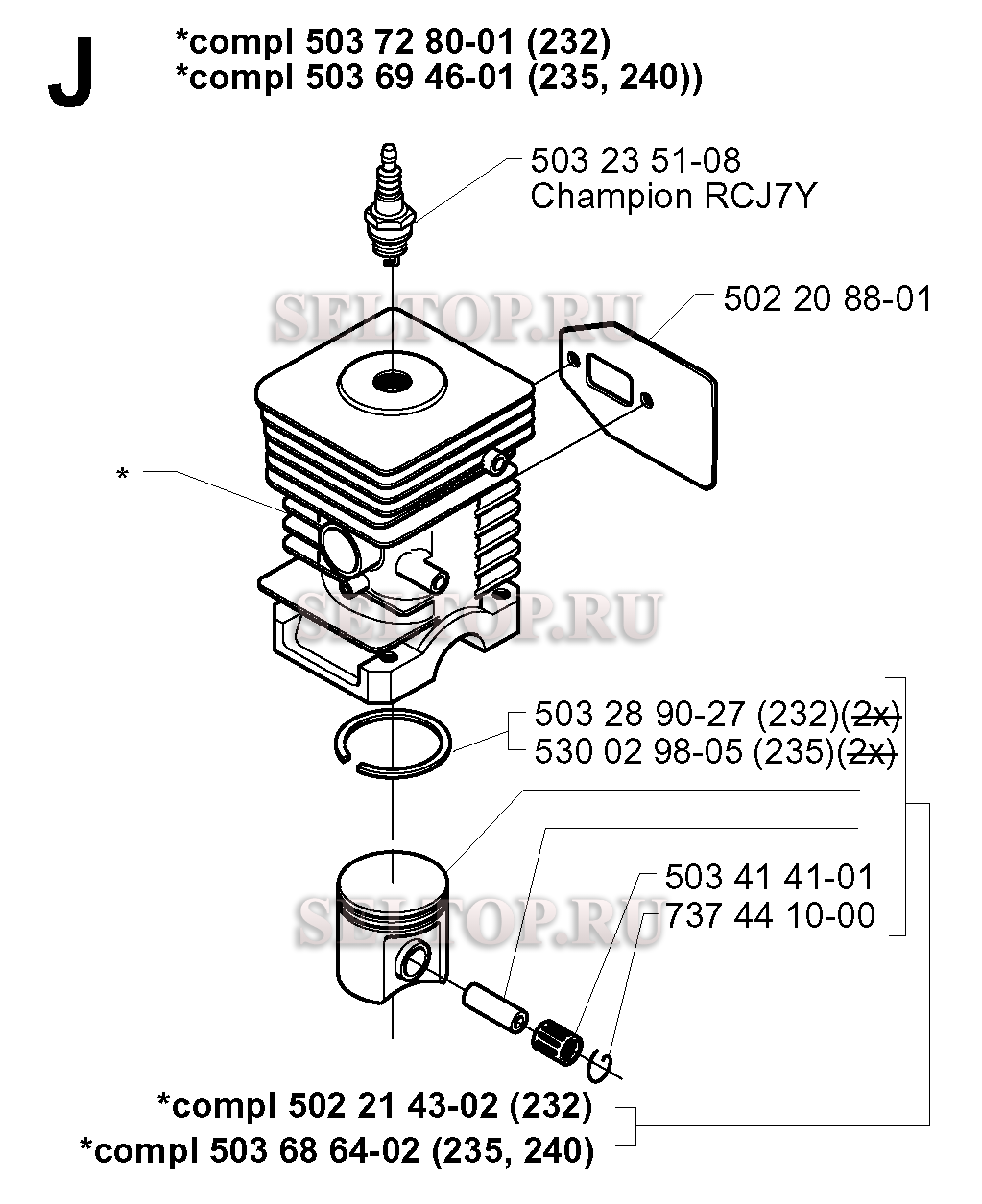 Поршень, цилиндр для триммера Husqvarna 232 R (c 2000-04), взрыв-схема:
