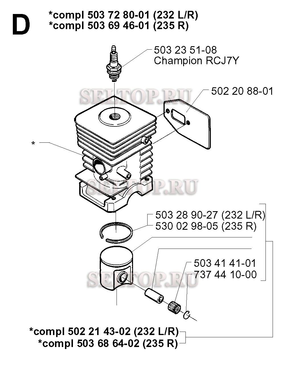 Поршень, цилиндр для триммера Husqvarna 235 R (c 1997-02), взрыв-схема: