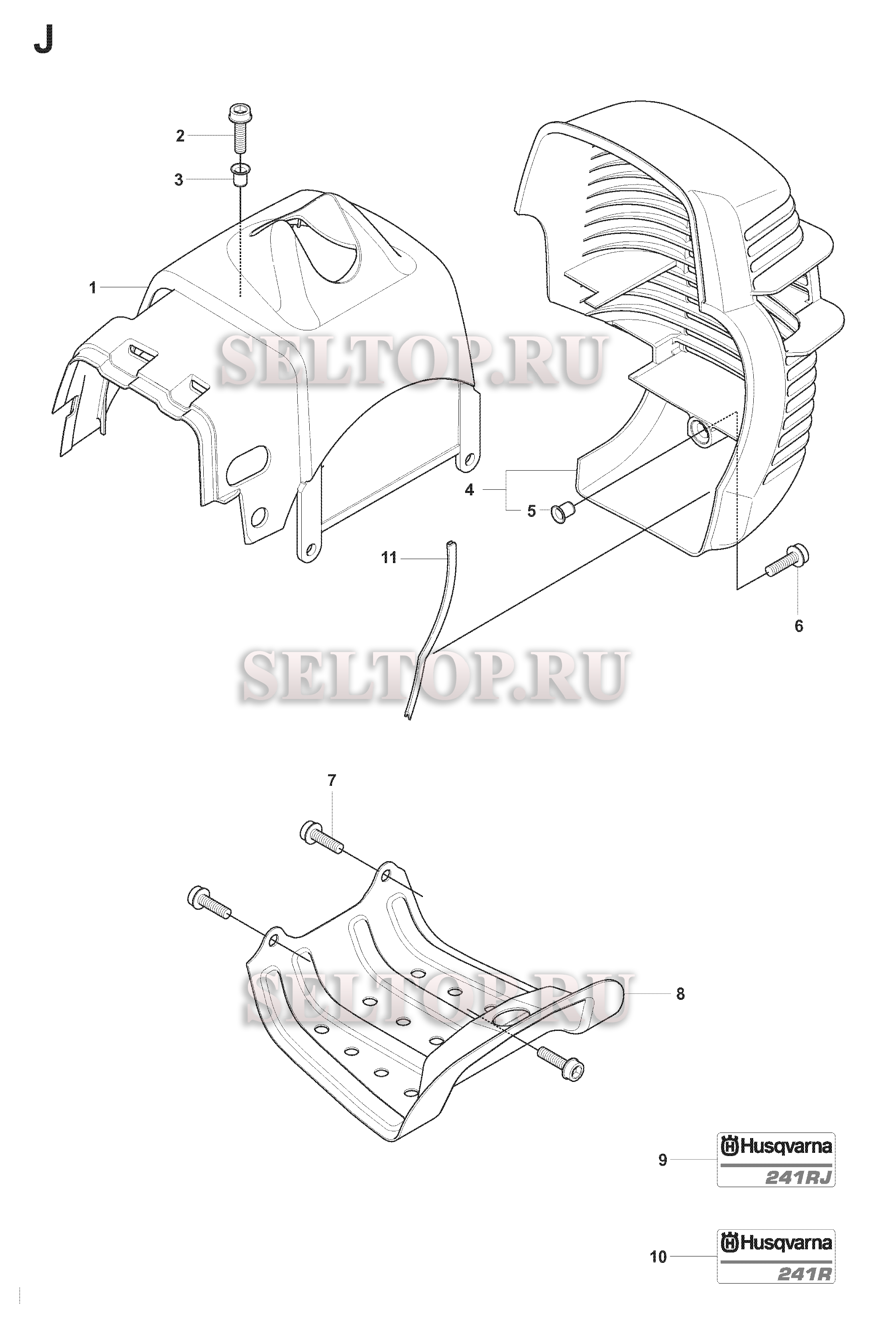 Кожух для триммера Husqvarna 241 R (c 2007-11), взрыв-схема: