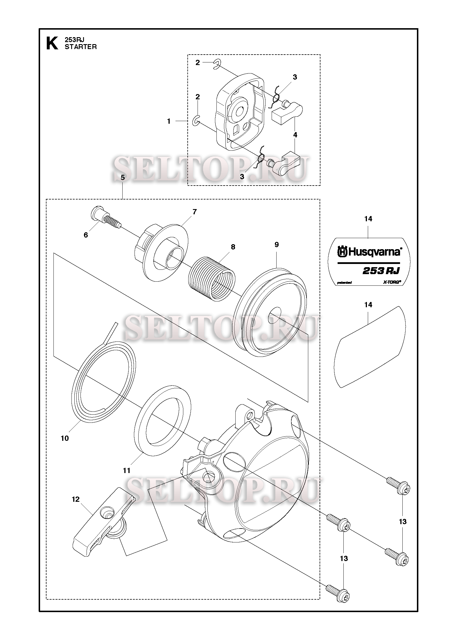 Стартер для триммера Husqvarna 253 RJ (c 2011-08), взрыв-схема: