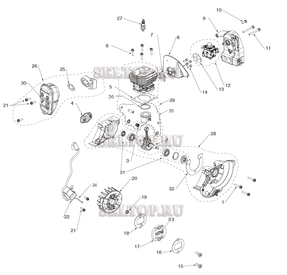 Двигатель для триммера Husqvarna 325 R (c 2018-11), взрыв-схема: