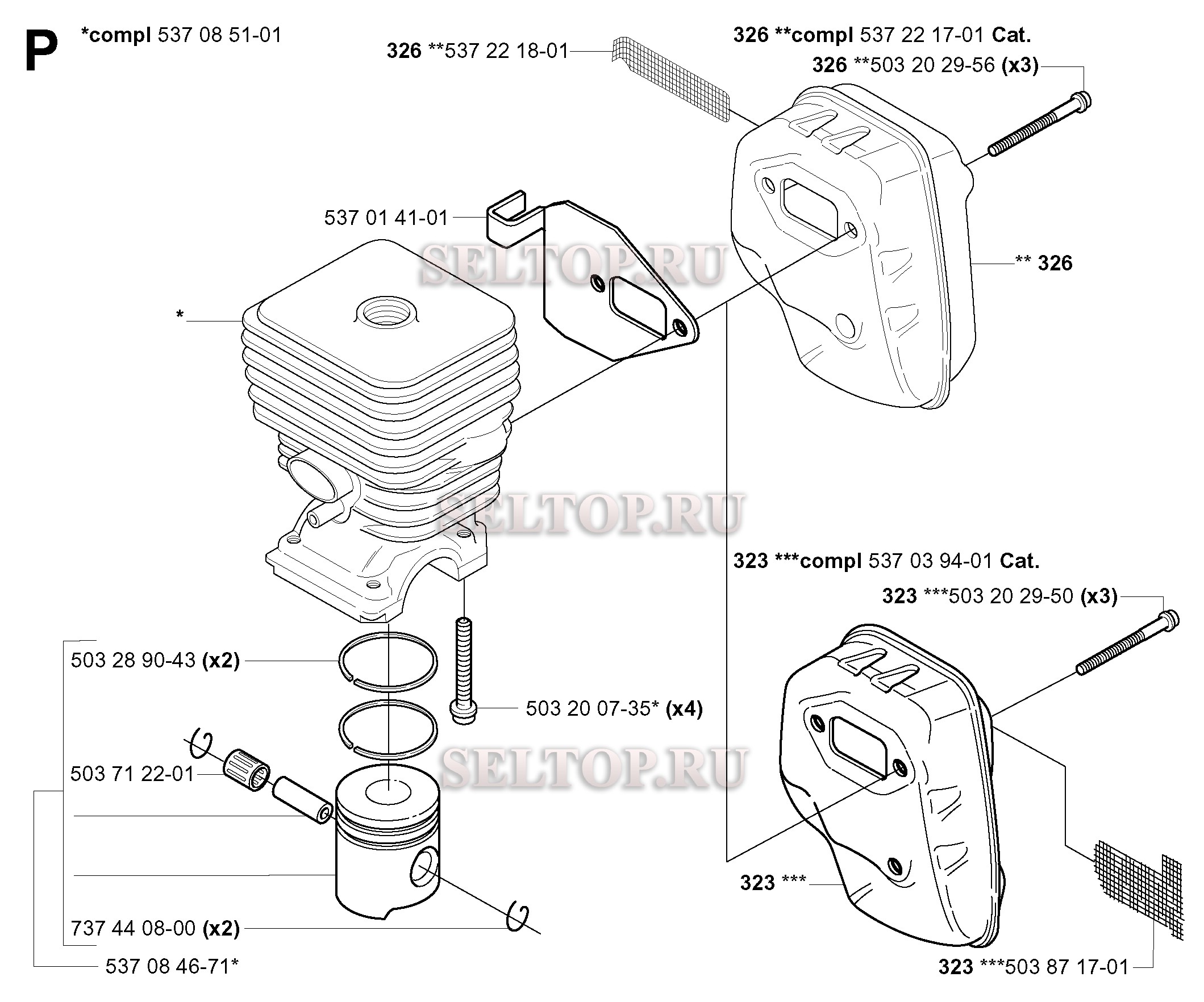 Поршень, цилиндр для триммера Husqvarna 326 LDx (с 2004-03), взрыв-схема: