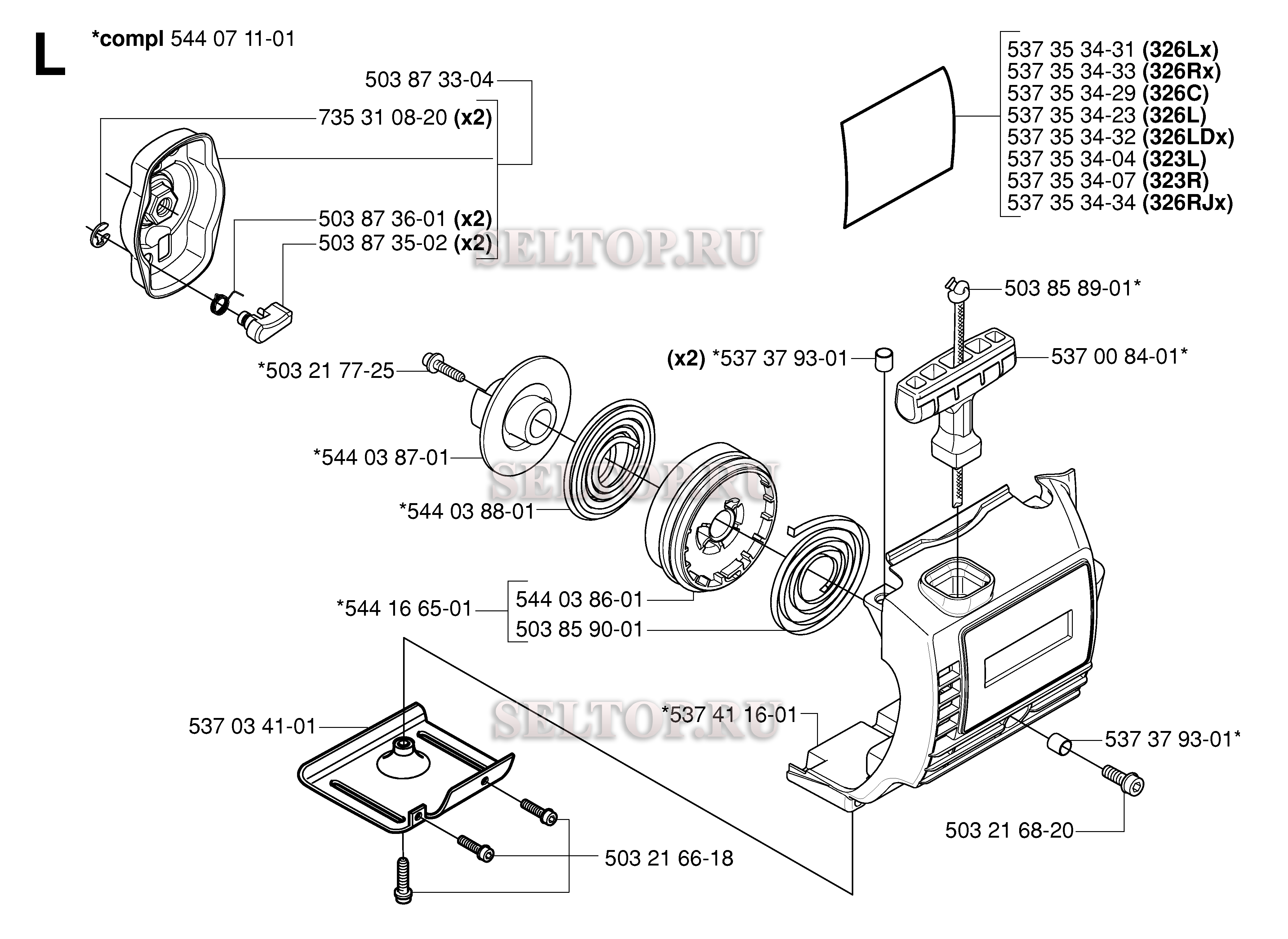 Стартер для триммера Husqvarna 326 RX (c 2006-04), взрыв-схема: