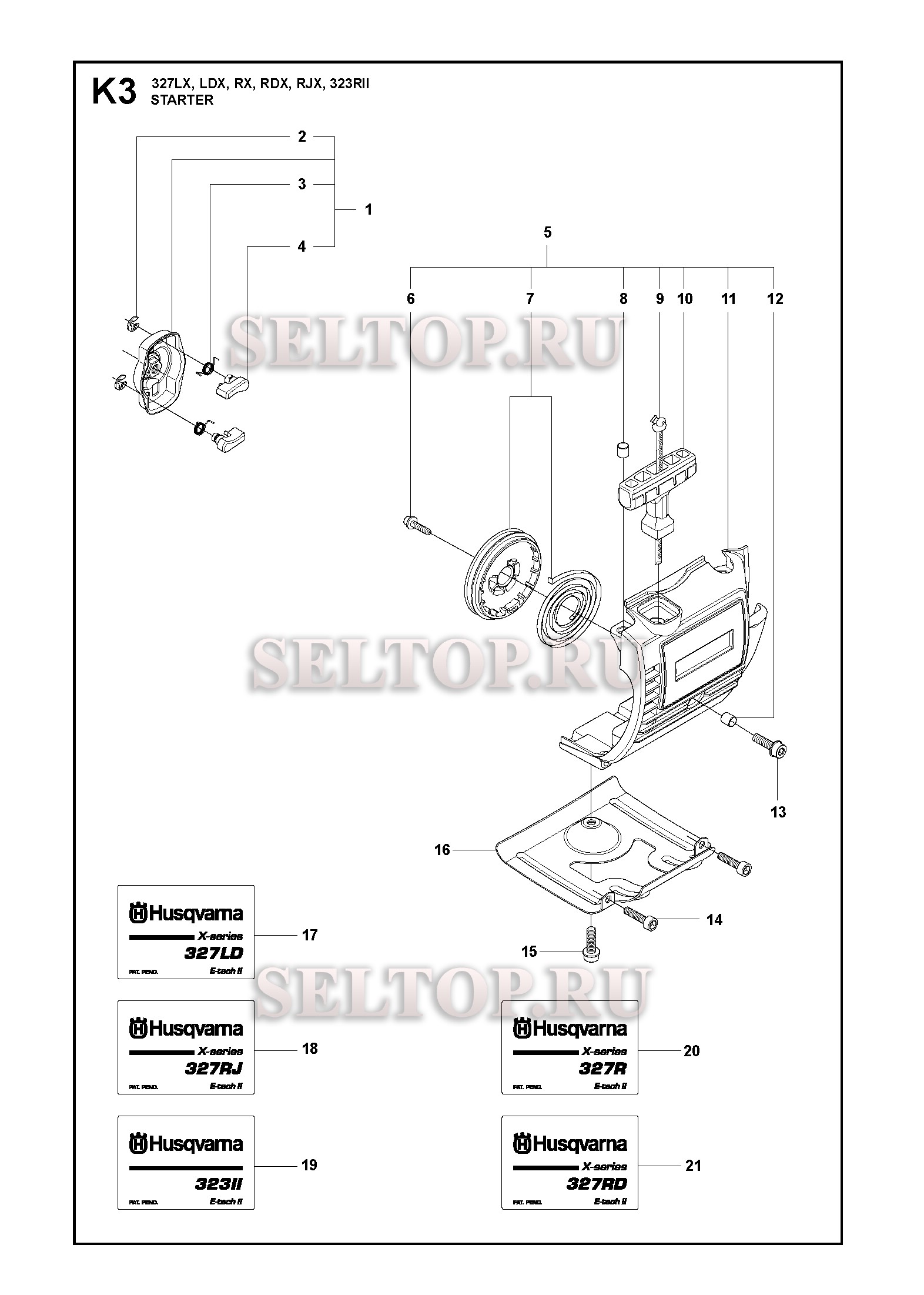 Стартер для триммера Husqvarna 327 LDx (с 2012-01) (вариант 3), взрыв-схема: