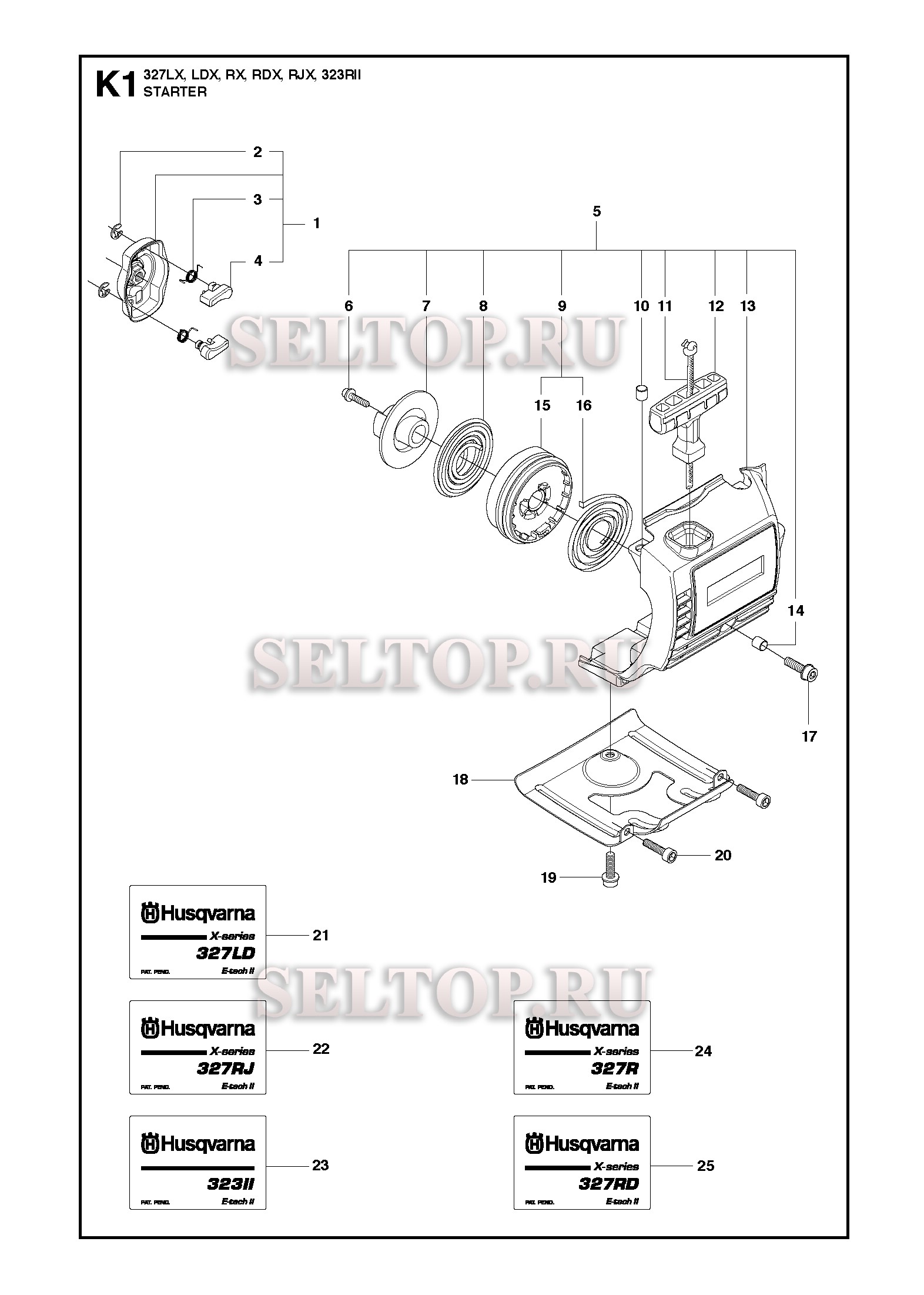 Стартер для триммера Husqvarna 327 LDx (с 2012-01), взрыв-схема: