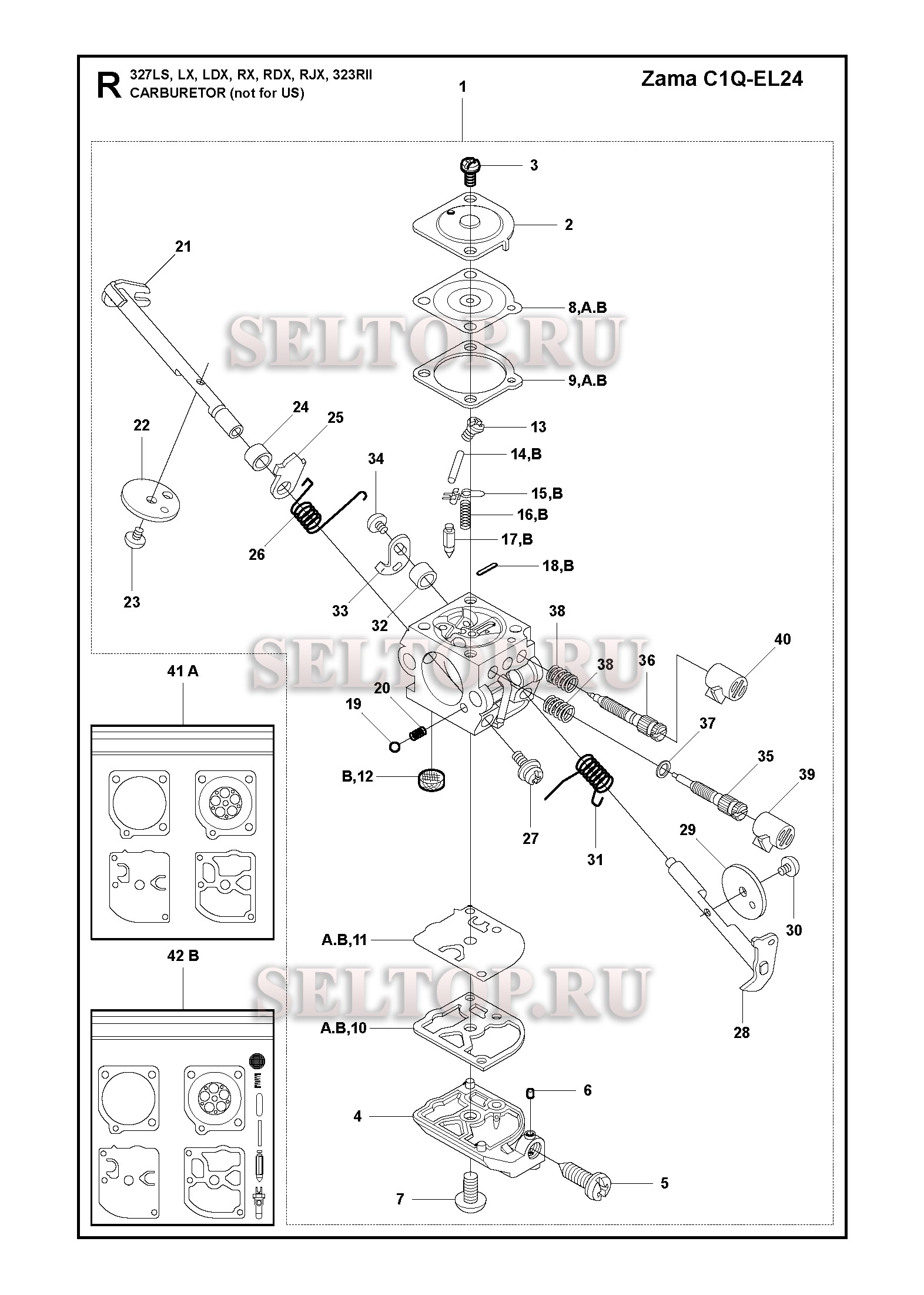 Карбюратор (не для США) для триммера Husqvarna 327 Lx (с 2012-01), взрыв-схема: