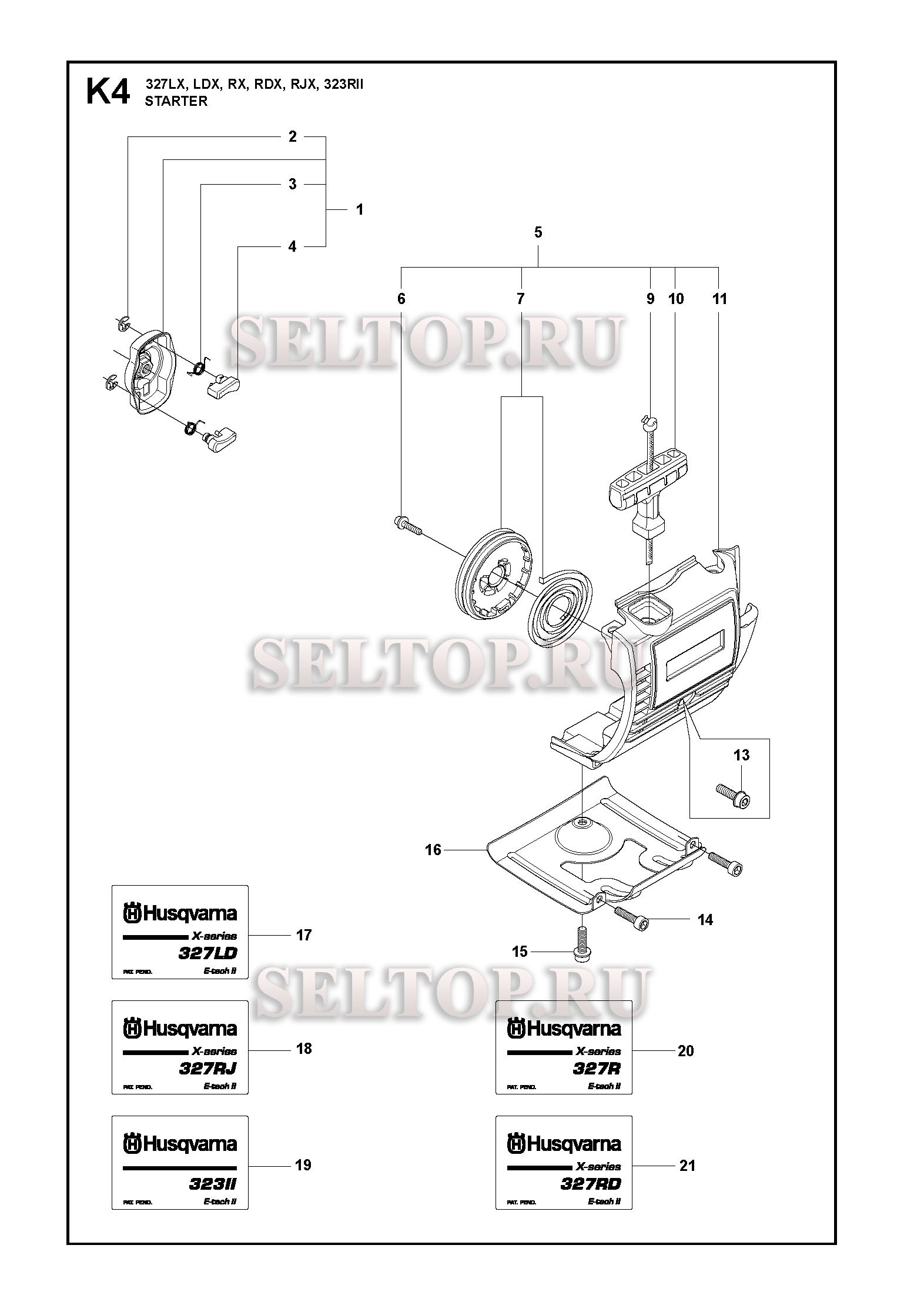 Стартер (вариант 4) для триммера Husqvarna 327 RJX (c 2009,2010), взрыв-схема: