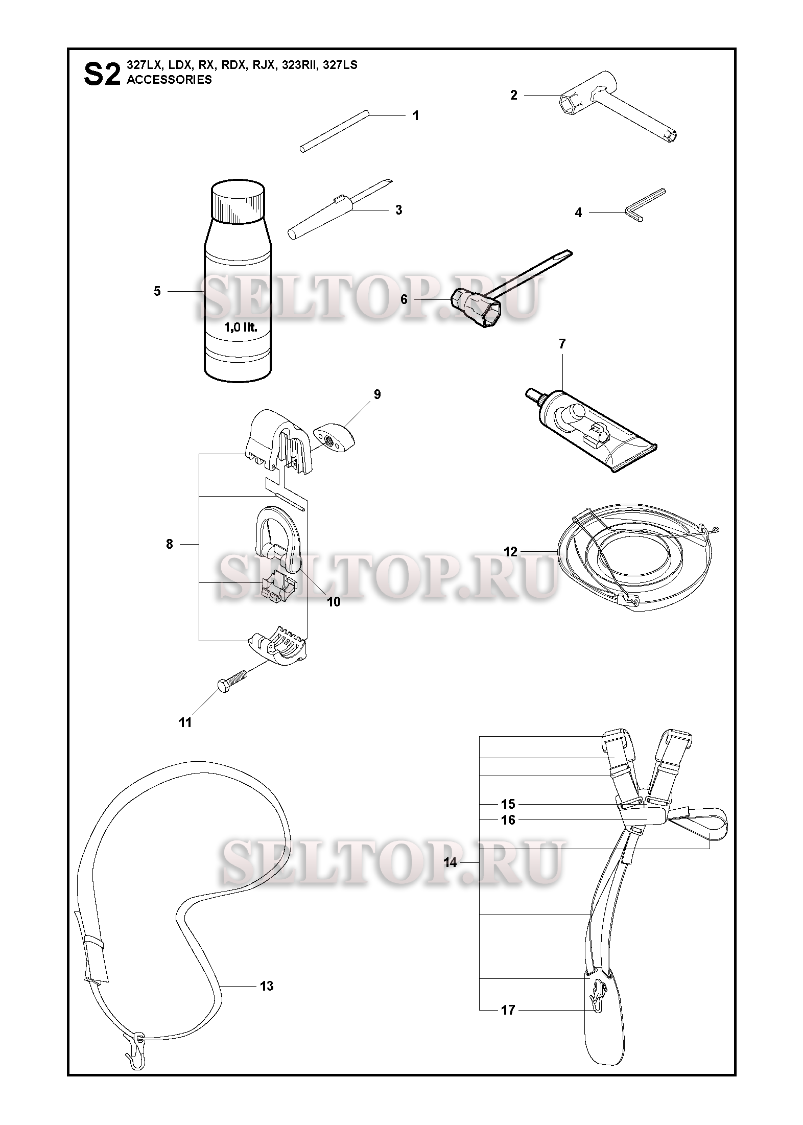 Аксессуары (вариант 2) для триммера Husqvarna 327 RX (c 2009,2010), взрыв-схема: