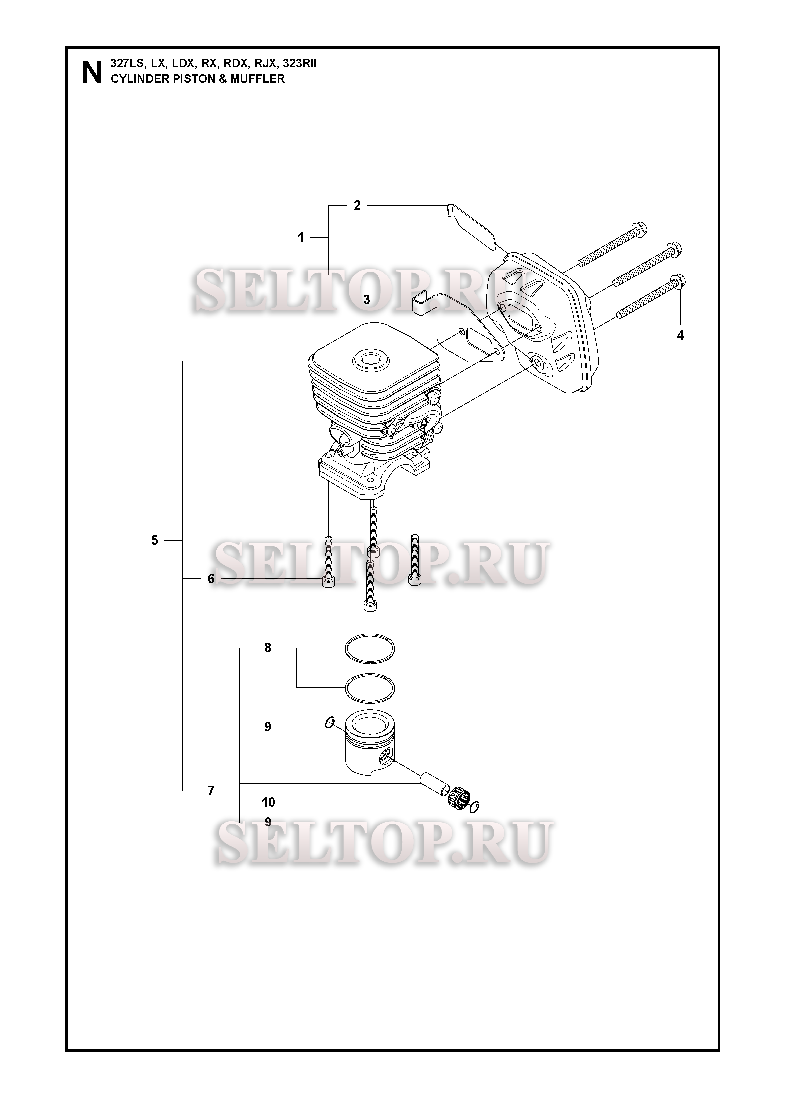 Цилиндр, поршень, глушитель для триммера Husqvarna 327 RX (c 2009,2010), взрыв-схема: