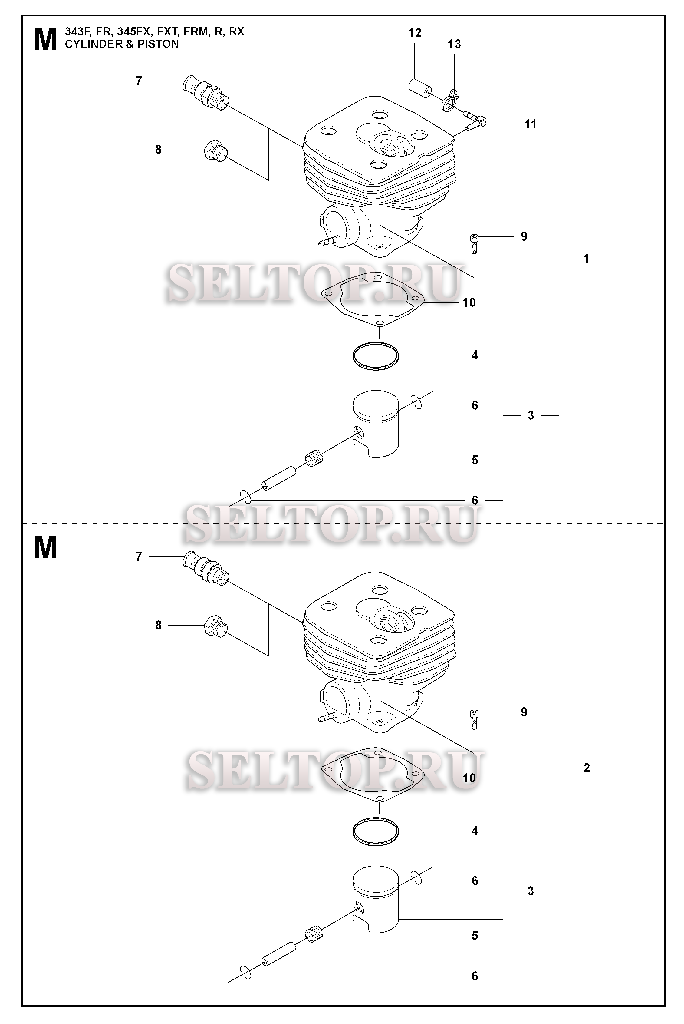 Поршень, цилиндр для триммера Husqvarna 343 F (c 2008-05), взрыв-схема:
