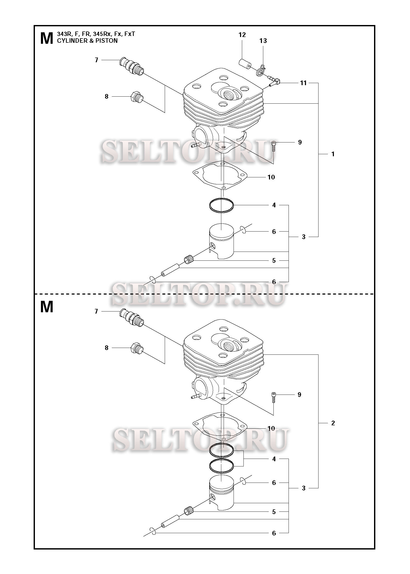 Поршень, цилиндр для триммера Husqvarna 343 F (c 2011-02), взрыв-схема:
