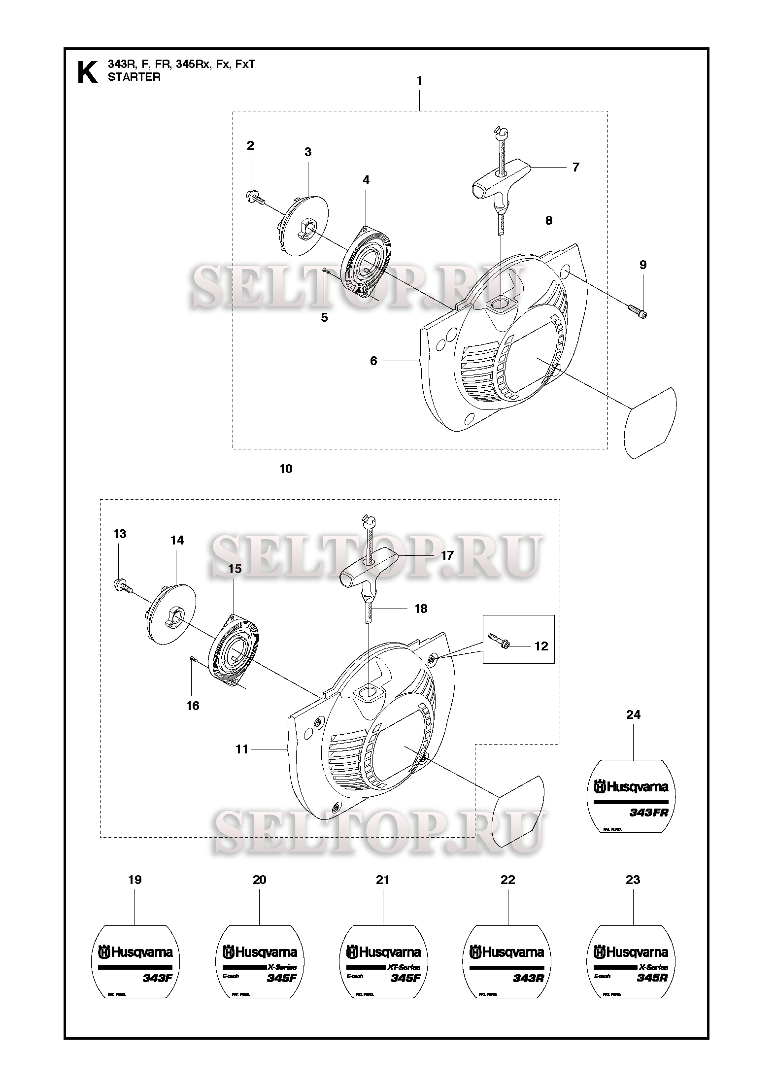 Стартер для триммера Husqvarna 343 F (c 2011-02), взрыв-схема: