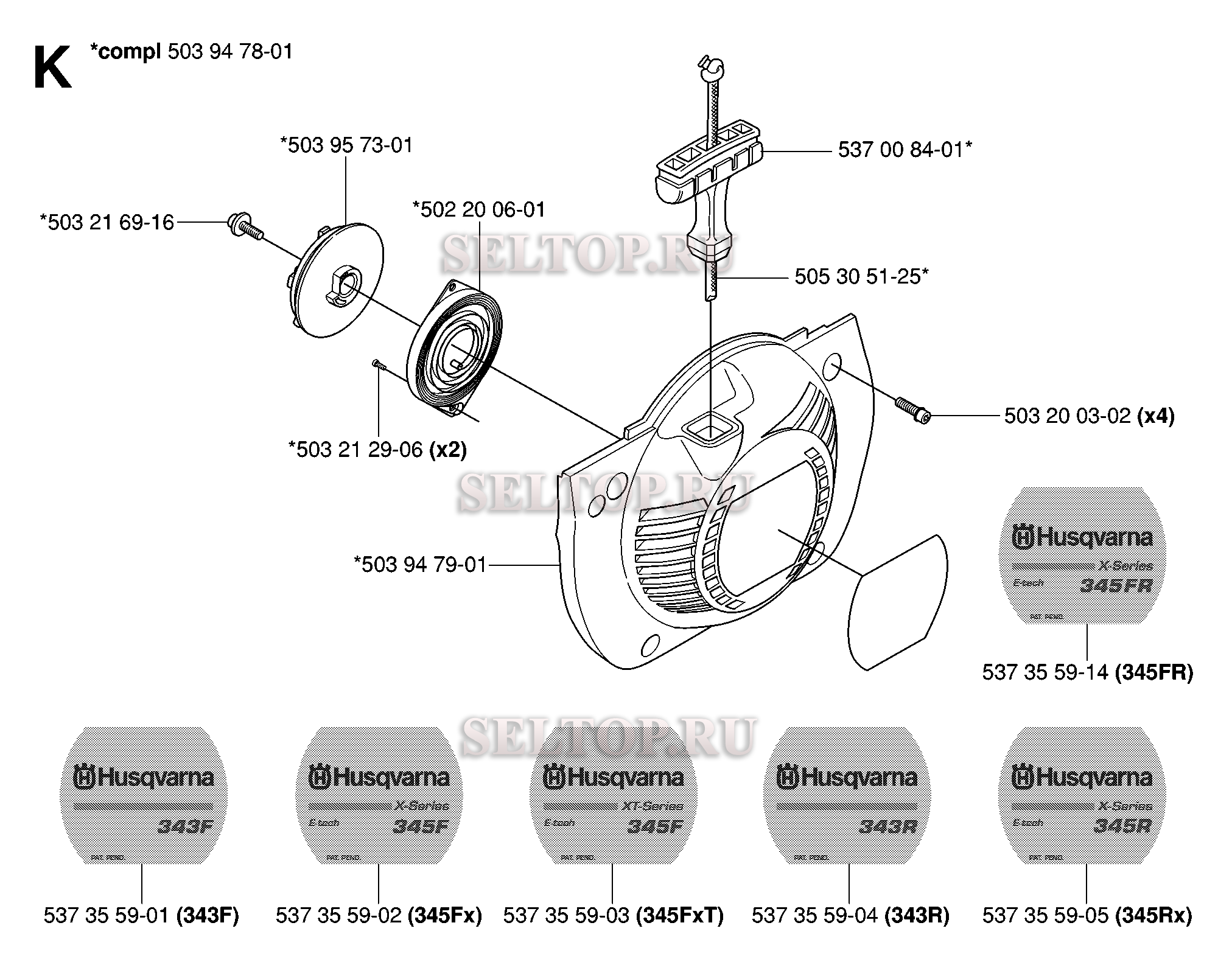 Стартер для триммера Husqvarna 343 R (c 2006-10), взрыв-схема: