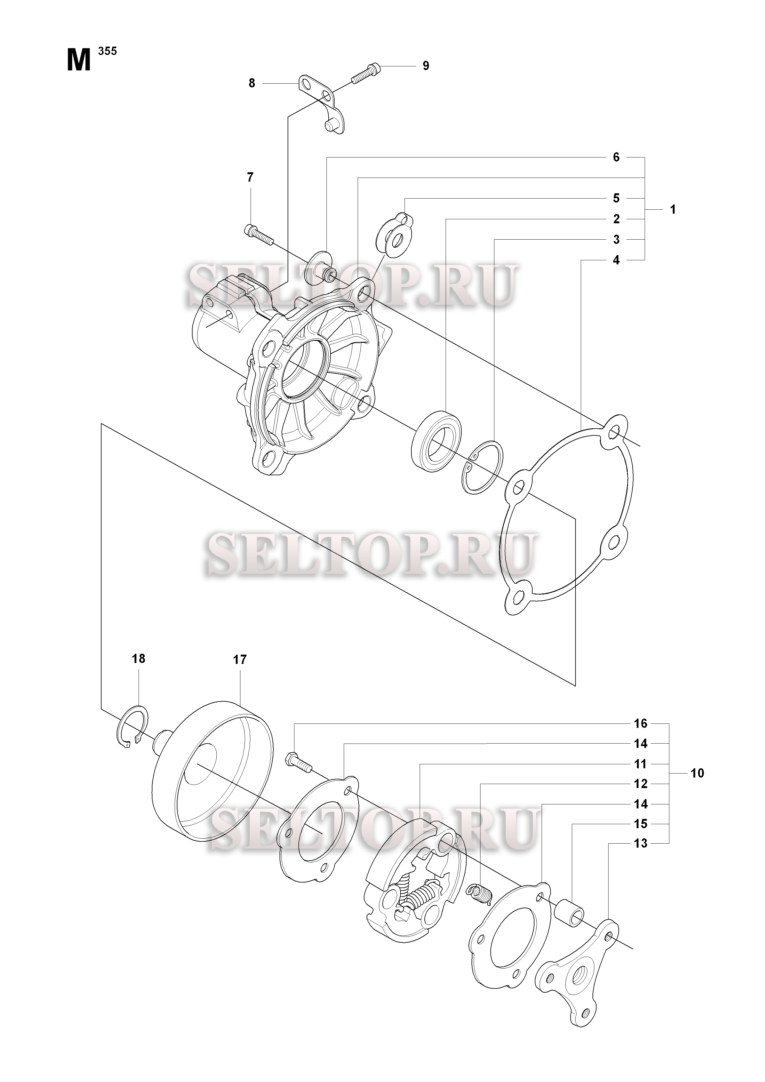 Сцепление для триммера Husqvarna 355 FX (c 2008-07), взрыв-схема: